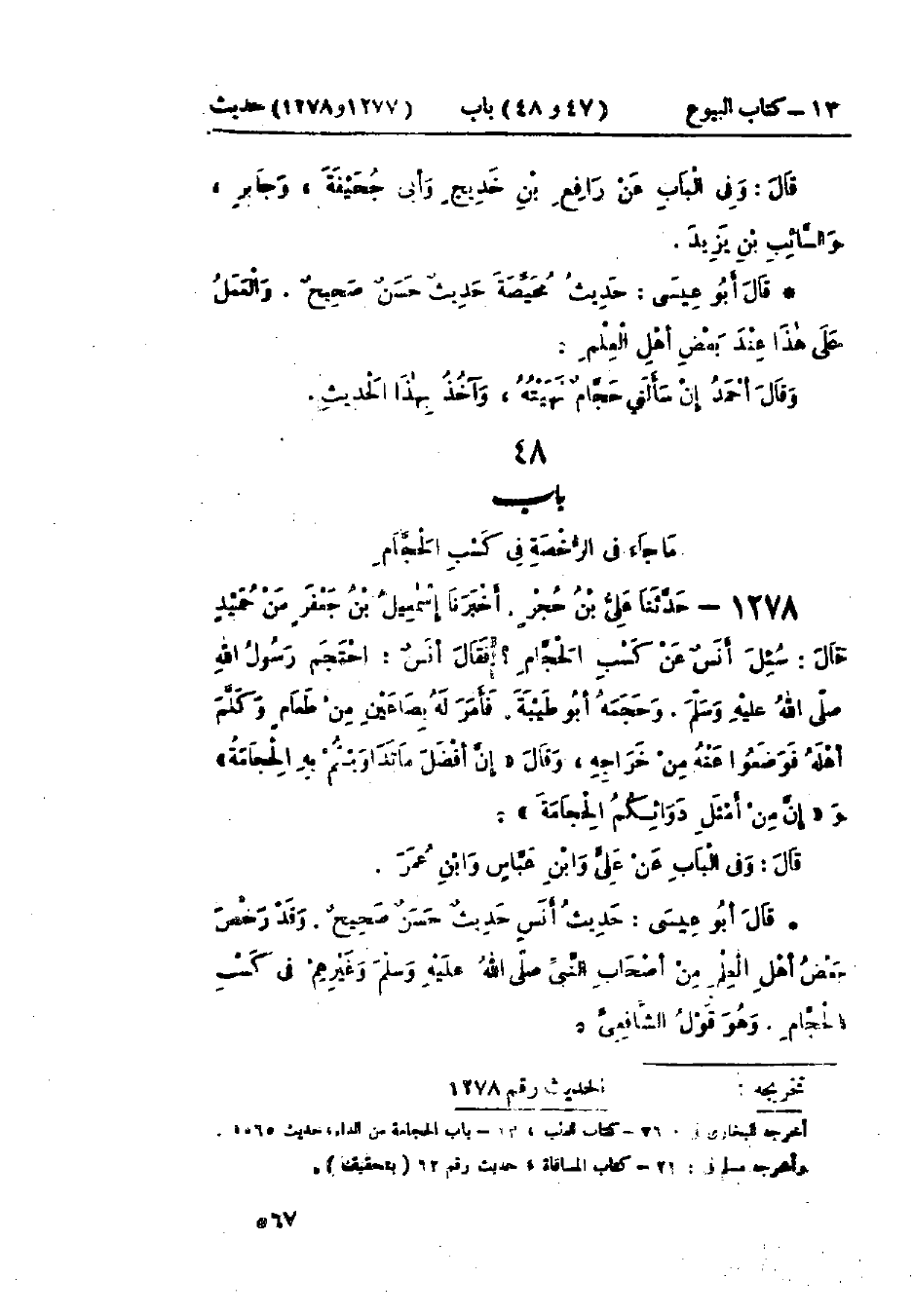 1277 - حَدَّثَنَا قُتَيْبَةُ، عَنْ مَالِكِ بْنِ أَنَسٍ، عَنْ ابْنِ شِهَابٍ، عَنْ ابْنِ مُحَيِّصَةَ، أَخِي بَنِي حَارِثَةَ، عَنْ أَبِيهِ، أَنَّهُ اسْتَأْذَنَ النَّبِيَّ صَلَّى اللَّهُ عَلَيْهِ وَسَلَّمَ فِي إِجَارَةِ الحَجَّامِ، «فَنَهَاهُ عَنْهَا»، فَلَمْ يَزَلْ يَسْأَلُهُ وَيَسْتَأْذِنُهُ، حَتَّى قَالَ: «§اعْلِفْهُ نَاضِحَكَ، وَأَطْعِمْهُ رَقِيقَكَ» -[568]- وَفِي البَابِ عَنْ رَافِعِ بْنِ خَدِيجٍ، وَأَبِي جُحَيْفَةَ، وَجَابِرٍ، وَالسَّائِبِ بْنِ يَزِيدَ. حَدِيثُ مُحَيِّصَةَ حَدِيثٌ حَسَنٌ، وَالعَمَلُ عَلَى هَذَا عِنْدَ بَعْضِ أَهْلِ العِلْمِ وقَالَ أَحْمَدُ: إِنْ سَأَلَنِي حَجَّامٌ نَهَيْتُهُ، وَآخُذُ بِهَذَا الحَدِيثِ