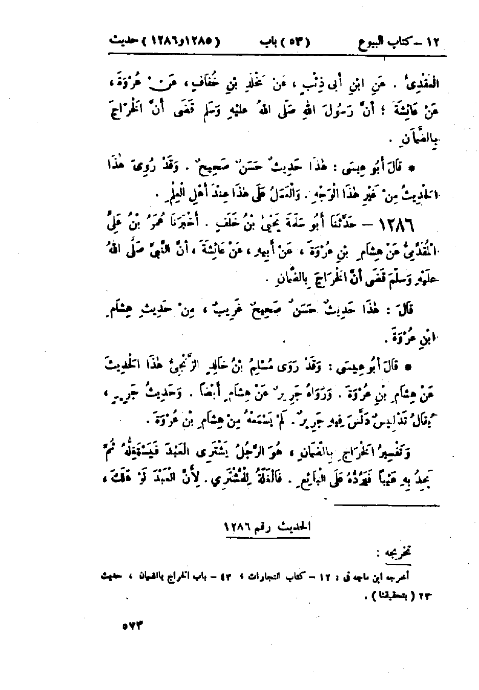 1285 - حَدَّثَنَا مُحَمَّدُ بْنُ المُثَنَّى قَالَ: حَدَّثَنَا عُثْمَانُ بْنُ عُمَرَ، وَأَبُو عَامِرٍ -[574]- العَقَدِيُّ، عَنْ ابْنِ أَبِي ذِئْبٍ، عَنْ مَخْلَدِ بْنِ خُفَافٍ، عَنْ عُرْوَةَ، عَنْ عَائِشَةَ، «أَنَّ رَسُولَ اللَّهِ صَلَّى اللَّهُ عَلَيْهِ وَسَلَّمَ §قَضَى أَنَّ الخَرَاجَ بِالضَّمَانِ»: هَذَا حَدِيثٌ حَسَنٌ صَحِيحٌ، وَقَدْ رُوِيَ هَذَا الحَدِيثُ مِنْ غَيْرِ هَذَا الوَجْهِ، وَالعَمَلُ عَلَى هَذَا عِنْدَ أَهْلِ العِلْمِ