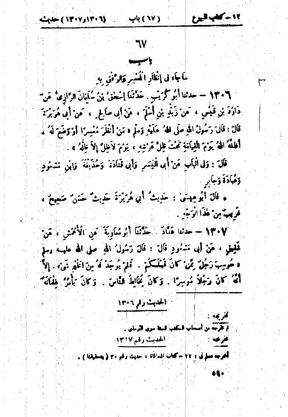1305 - حَدَّثَنَا هَنَّادٌ، وَمَحْمُودُ بْنُ غَيْلَانَ، قَالَا: حَدَّثَنَا وَكِيعٌ، عَنْ سُفْيَانَ، عَنْ سِمَاكِ بْنِ حَرْبٍ، عَنْ سُوَيْدِ بْنِ قَيْسٍ، قَالَ: جَلَبْتُ أَنَا وَمَخْرَمَةُ الْعَبْدِيُّ بَزًّا مِنْ هَجَرَ، فَجَاءَنَا النَّبِيُّ صَلَّى اللَّهُ عَلَيْهِ وَسَلَّمَ فَسَاوَمَنَا بِسَرَاوِيلَ، وَعِنْدِي وَزَّانٌ يَزِنُ بِالْأُجْرَةِ، فَقَالَ النَّبِيُّ صَلَّى اللَّهُ عَلَيْهِ وَسَلَّمَ لِلْوَزَّانِ: «§زِنْ وَأَرْجِحْ» وَفِي البَابِ عَنْ جَابِرٍ، وَأَبِي هُرَيْرَةَ: حَدِيثُ سُوَيْدٍ حَدِيثٌ حَسَنٌ صَحِيحٌ، وَأَهْلُ العِلْمِ يَسْتَحِبُّونَ الرُّجْحَانَ فِي الوَزْنِ وَرَوَى شُعْبَةُ هَذَا الحَدِيثَ، عَنْ سِمَاكٍ، فَقَالَ: عَنْ أَبِي صَفْوَانَ وَذَكَرَ الحَدِيثَ