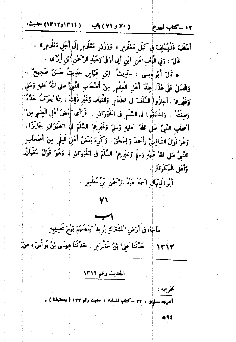 1311 - حَدَّثَنَا أَحْمَدُ بْنُ مَنِيعٍ قَالَ: حَدَّثَنَا سُفْيَانُ، عَنْ ابْنِ أَبِي نَجِيحٍ، عَنْ عَبْدِ اللَّهِ بْنِ كَثِيرٍ، عَنْ أَبِي المِنْهَالِ، عَنْ ابْنِ عَبَّاسٍ قَالَ: قَدِمَ رَسُولُ اللَّهِ صَلَّى اللَّهُ عَلَيْهِ وَسَلَّمَ المَدِينَةَ وَهُمْ يُسْلِفُونَ فِي التَّمْرِ، فَقَالَ: «§مَنْ -[595]- أَسْلَفَ فَلْيُسْلِفْ فِي كَيْلٍ مَعْلُومٍ وَوَزْنٍ مَعْلُومٍ إِلَى أَجَلٍ مَعْلُومٍ» وَفِي البَابِ عَنْ ابْنِ أَبِي أَوْفَى، وَعَبْدِ الرَّحْمَنِ بْنِ أَبْزَى: حَدِيثُ ابْنِ عَبَّاسٍ حَدِيثٌ حَسَنٌ صَحِيحٌ وَالعَمَلُ عَلَى هَذَا عِنْدَ أَهْلِ العِلْمِ مِنْ أَصْحَابِ النَّبِيِّ صَلَّى اللَّهُ عَلَيْهِ وَسَلَّمَ وَغَيْرِهِمْ: أَجَازُوا السَّلَفَ فِي الطَّعَامِ وَالثِّيَابِ وَغَيْرِ ذَلِكَ مِمَّا يُعْرَفُ حَدُّهُ وَصِفَتُهُ، وَاخْتَلَفُوا فِي السَّلَمِ فِي الحَيَوَانِ، فَرَأَى بَعْضُ أَهْلِ العِلْمِ مِنْ أَصْحَابِ النَّبِيِّ صَلَّى اللَّهُ عَلَيْهِ وَسَلَّمَ وَغَيْرِهِمُ السَّلَمَ فِي الحَيَوَانِ جَائِزًا، وَهُوَ قَوْلُ الشَّافِعِيِّ، وَأَحْمَدَ، وَإِسْحَاقَ، وَكَرِهَ بَعْضُ أَهْلِ العِلْمِ مِنْ أَصْحَابِ النَّبِيِّ صَلَّى اللَّهُ عَلَيْهِ وَسَلَّمَ وَغَيْرِهِمُ السَّلَمَ فِي الحَيَوَانِ، وَهُوَ قَوْلُ سُفْيَانَ، وَأَهْلِ الْكُوفَةِ، أَبُو المِنْهَالِ اسْمُهُ عَبْدُ الرَّحْمَنِ بْنُ مُطْعِمٍ