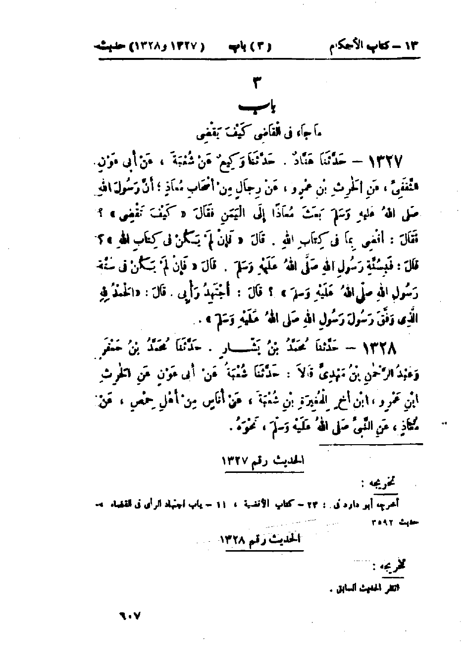 1326 - حَدَّثَنَا الحُسَيْنُ بْنُ مَهْدِيٍّ قَالَ: حَدَّثَنَا عَبْدُ الرَّزَّاقِ قَالَ: أَخْبَرَنَا مَعْمَرٌ، عَنْ سُفْيَانَ الثَّوْرِيِّ، عَنْ يَحْيَى بْنِ سَعِيدٍ، عَنْ أَبِي بَكْرِ بْنِ عَمْرِو بْنِ حَزْمٍ، عَنْ أَبِي سَلَمَةَ، عَنْ أَبِي هُرَيْرَةَ قَالَ: قَالَ رَسُولُ اللَّهِ صَلَّى اللَّهُ عَلَيْهِ وَسَلَّمَ: «§إِذَا حَكَمَ الحَاكِمُ فَاجْتَهَدَ فَأَصَابَ، فَلَهُ أَجْرَانِ، وَإِذَا حَكَمَ فَأَخْطَأَ، فَلَهُ أَجْرٌ وَاحِدٌ» وَفِي البَابِ عَنْ عَمْرِو بْنِ العَاصِ، وَعُقْبَةَ بْنِ عَامِرٍ: حَدِيثُ أَبِي هُرَيْرَةَ حَدِيثٌ حَسَنٌ غَرِيبٌ مِنْ هَذَا الوَجْهِ لَا نَعْرِفُهُ مِنْ حَدِيثِ سُفْيَانَ الثَّوْرِيِّ عَنْ يَحْيَى بْنِ سَعِيدٍ إِلَّا مِنْ حَدِيثِ عَبْدِ الرَّزَّاقِ عَنْ مَعْمَرٍ عَنْ سُفْيَانَ الثَّوْرِيِّ