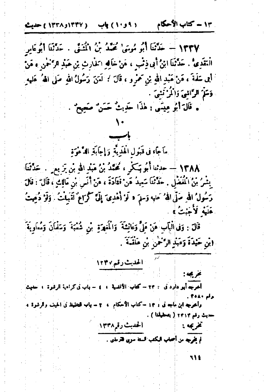 1336 - حَدَّثَنَا قُتَيْبَةُ قَالَ: حَدَّثَنَا أَبُو عَوَانَةَ، عَنْ عُمَرَ بْنِ أَبِي سَلَمَةَ، عَنْ أَبِيهِ، عَنْ أَبِي هُرَيْرَةَ قَالَ: «§لَعَنَ رَسُولُ اللَّهِ صَلَّى اللَّهُ عَلَيْهِ وَسَلَّمَ الرَّاشِيَ وَالمُرْتَشِيَ فِي الحُكْمِ» وَفِي البَابِ عَنْ عَبْدِ اللَّهِ بْنِ عَمْرٍو، وَعَائِشَةَ، وَابْنِ حَدِيدَةَ، وَأُمِّ سَلَمَةَ: حَدِيثُ أَبِي هُرَيْرَةَ حَدِيثٌ حَسَنٌ وَقَدْ رُوِيَ هَذَا الحَدِيثُ، عَنْ أَبِي سَلَمَةَ بْنِ عَبْدِ الرَّحْمَنِ، عَنْ عَبْدِ اللَّهِ بْنِ عَمْرٍو، عَنِ النَّبِيِّ صَلَّى اللَّهُ عَلَيْهِ وَسَلَّمَ، وَرُوِيَ عَنْ أَبِي سَلَمَةَ، عَنْ أَبِيهِ، عَنِ النَّبِيِّ صَلَّى اللَّهُ عَلَيْهِ وَسَلَّمَ وَلَا يَصِحُّ وَسَمِعْتُ عَبْدَ اللَّهِ بْنَ عَبْدِ الرَّحْمَنِ يَقُولُ: حَدِيثُ أَبِي سَلَمَةَ، عَنْ عَبْدِ اللَّهِ بْنِ عَمْرٍو عَنِ النَّبِيِّ صَلَّى اللَّهُ عَلَيْهِ وَسَلَّمَ أَحْسَنُ شَيْءٍ فِي هَذَا البَابِ وَأَصَحُّ