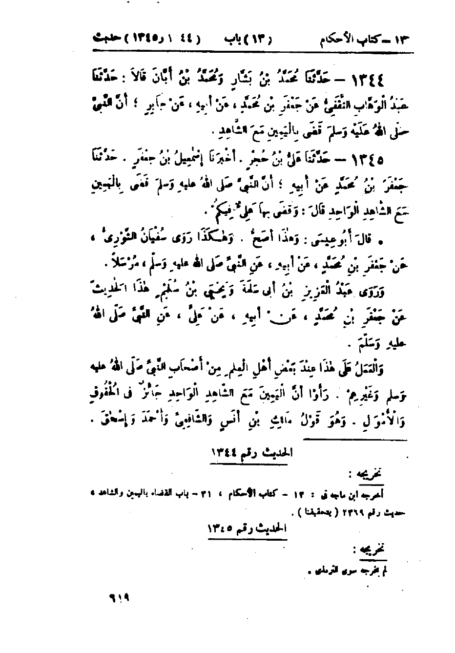 1343 - حَدَّثَنَا يَعْقُوبُ بْنُ إِبْرَاهِيمَ الدَّوْرَقِيُّ قَالَ: حَدَّثَنَا عَبْدُ العَزِيزِ بْنُ مُحَمَّدٍ، قَالَ: حَدَّثَنِي رَبِيعَةُ بْنُ أَبِي عَبْدِ الرَّحْمَنِ، عَنْ سُهَيْلِ بْنِ أَبِي صَالِحٍ، عَنْ أَبِيهِ، عَنْ أَبِي هُرَيْرَةَ قَالَ: «§قَضَى رَسُولُ اللَّهِ صَلَّى اللَّهُ عَلَيْهِ وَسَلَّمَ بِاليَمِينِ مَعَ الشَّاهِدِ الوَاحِدِ» قَالَ رَبِيعَةُ: وَأَخْبَرَنِي ابْنٌ لِسَعْدِ بْنِ عُبَادَةَ قَالَ: وَجْدنَا فِي كِتَاب سَعْدٍ أَنَّ النَّبِيَّ صَلَّى اللَّهُ عَلَيْهِ وَسَلَّمَ قَضَى بِاليَمِينِ مَعَ الشَّاهِدِ، وَفِي البَابِ عَنْ عَلِيٍّ، وَجَابِرٍ، وَابْنِ عَبَّاسٍ، وَسُرَّقَ: حَدِيثُ أَبِي هُرَيْرَةَ أَنَّ النَّبِيَّ صَلَّى اللَّهُ عَلَيْهِ وَسَلَّمَ قَضَى بِاليَمِينِ مَعَ الشَّاهِدِ الوَاحِدِ حَدِيثٌ حَسَنٌ غَرِيبٌ