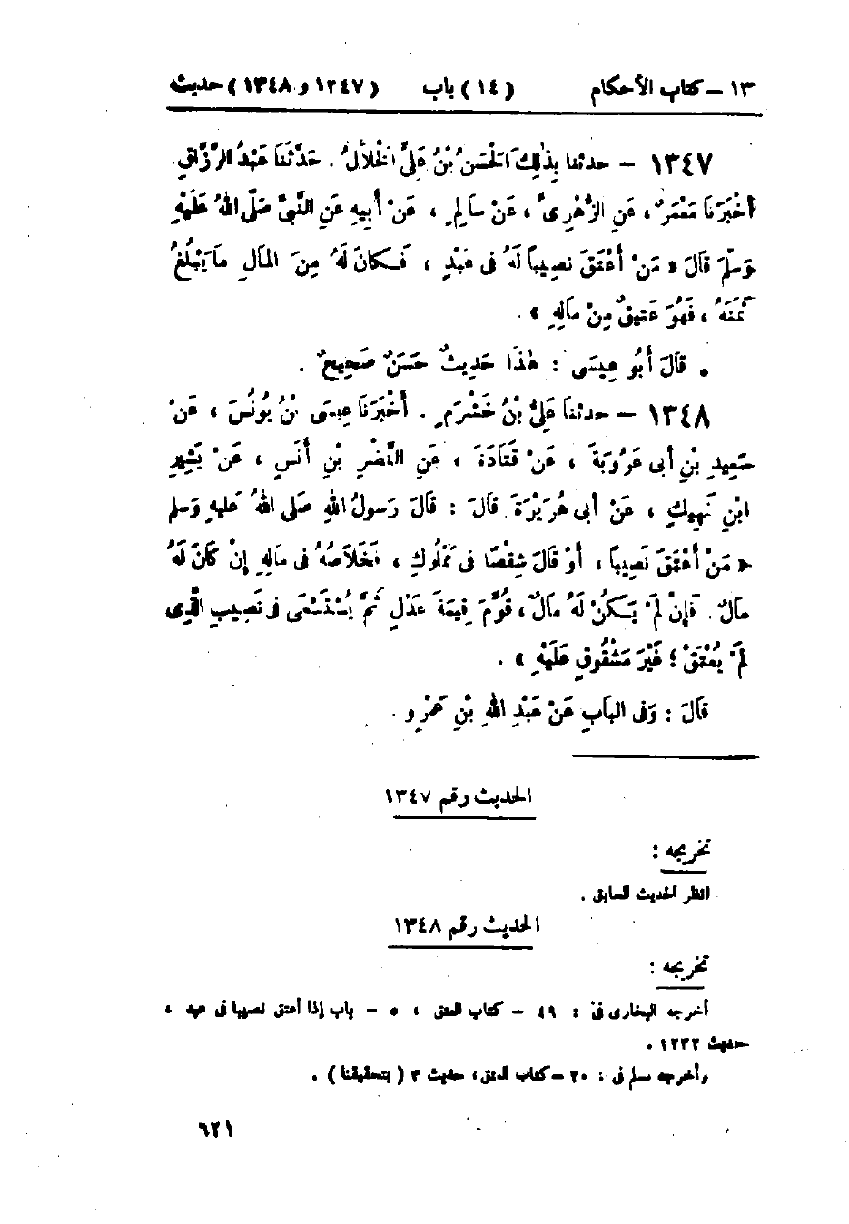 1346 - حَدَّثَنَا أَحْمَدُ بْنُ مَنِيعٍ قَالَ: حَدَّثَنَا إِسْمَاعِيلُ بْنُ إِبْرَاهِيمَ، عَنْ أَيُّوبَ، عَنْ نَافِعٍ، عَنْ ابْنِ عُمَرَ، عَنِ النَّبِيِّ صَلَّى اللَّهُ عَلَيْهِ وَسَلَّمَ قَالَ: «§مَنْ أَعْتَقَ نَصِيبًا»، أَوْ قَالَ: «شِقْصًا»، أَوْ قَالَ: «شِرْكًا لَهُ فِي عَبْدٍ، فَكَانَ لَهُ مِنَ المَالِ مَا يَبْلُغُ ثَمَنَهُ بِقِيمَةِ العَدْلِ فَهُوَ عَتِيقٌ، وَإِلَّا فَقَدْ عَتَقَ مِنْهُ مَا عَتَقَ» قَالَ أَيُّوبُ: وَرُبَّمَا قَالَ نَافِعٌ فِي هَذَا الحَدِيثِ، يَعْنِي: «فَقَدْ عَتَقَ مِنْهُ مَا عَتَقَ»: حَدِيثُ ابْنِ عُمَرَ حَدِيثٌ حَسَنٌ صَحِيحٌ وَقَدْ رَوَاهُ سَالِمٌ، عَنْ أَبِيهِ، عَنِ النَّبِيِّ صَلَّى اللَّهُ عَلَيْهِ وَسَلَّمَ نَحْوَهُ