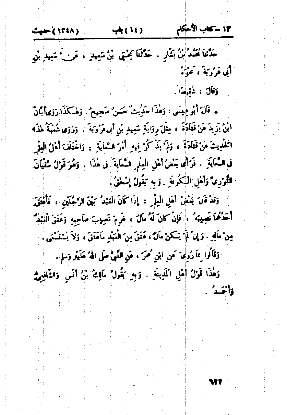 1348 - حَدَّثَنَا عَلِيُّ بْنُ خَشْرَمٍ قَالَ: أَخْبَرَنَا عِيسَى بْنُ يُونُسَ، عَنْ سَعِيدِ بْنِ أَبِي عَرُوبَةَ، عَنْ قَتَادَةَ، عَنْ النَّضْرِ بْنِ أَنَسٍ، عَنْ بَشِيرِ بْنِ نَهِيكٍ، عَنْ أَبِي هُرَيْرَةَ قَالَ: قَالَ رَسُولُ اللَّهِ صَلَّى اللَّهُ عَلَيْهِ وَسَلَّمَ: «§مَنْ أَعْتَقَ نَصِيبًا»، أَوْ قَالَ: «شِقْصًا فِي مَمْلُوكٍ فَخَلَاصُهُ فِي مَالِهِ، إِنْ كَانَ لَهُ مَالٌ، فَإِنْ لَمْ يَكُنْ لَهُ مَالٌ قُوِّمَ قِيمَةَ عَدْلٍ، ثُمَّ يُسْتَسْعَى فِي نَصِيبِ الَّذِي لَمْ يُعْتَقْ غَيْرَ مَشْقُوقٍ عَلَيْهِ» وَفِي البَابِ عَنْ عَبْدِ اللَّهِ بْنِ عَمْرٍو، -[623]- حَدَّثَنَا مُحَمَّدُ بْنُ بَشَّارٍ قَالَ: حَدَّثَنَا يَحْيَى بْنُ سَعِيدٍ، عَنْ سَعِيدِ بْنِ أَبِي عَرُوبَةَ نَحْوَهُ، وَقَالَ: «شَقِيصًا»: وَهَذَا حَدِيثٌ حَسَنٌ صَحِيحٌ وَهَكَذَا رَوَى أَبَانُ بْنُ يَزِيدَ، عَنْ قَتَادَةَ مِثْلَ رِوَايَةِ سَعِيدِ بْنِ أَبِي عَرُوبَةَ، وَرَوَى شُعْبَةُ هَذَا الحَدِيثَ، عَنْ قَتَادَةَ وَلَمْ يَذْكُرْ فِيهِ أَمْرَ السِّعَايَةِ وَاخْتَلَفَ أَهْلُ العِلْمِ فِي السِّعَايَةِ، فَرَأَى بَعْضُ أَهْلِ العِلْمِ السِّعَايَةَ فِي هَذَا، وَهُوَ قَوْلُ سُفْيَانَ الثَّوْرِيِّ، وَأَهْلِ الْكُوفَةِ، وَبِهِ يَقُولُ إِسْحَاقُ وَقَدْ قَالَ بَعْضُ أَهْلِ العِلْمِ: إِذَا كَانَ العَبْدُ بَيْنَ الرَّجُلَيْنِ فَأَعْتَقَ أَحَدُهُمَا نَصِيبَهُ، فَإِنْ كَانَ لَهُ مَالٌ غَرِمَ نَصِيبَ صَاحِبِهِ، وَعَتَقَ العَبْدُ مِنْ مَالِهِ، وَإِنْ لَمْ يَكُنْ لَهُ مَالٌ عَتَقَ مِنَ العَبْدِ مَا عَتَقَ وَلَا يُسْتَسْعَى، وَقَالُوا بِمَا رُوِيَ عَنْ ابْنِ عُمَرَ، عَنِ النَّبِيِّ صَلَّى اللَّهُ عَلَيْهِ وَسَلَّمَ، وَهَذَا قَوْلُ أَهْلِ المَدِينَةِ، وَبِهِ يَقُولُ مَالِكُ بْنُ أَنَسٍ، وَالشَّافِعِيُّ، وَأَحْمَدُ