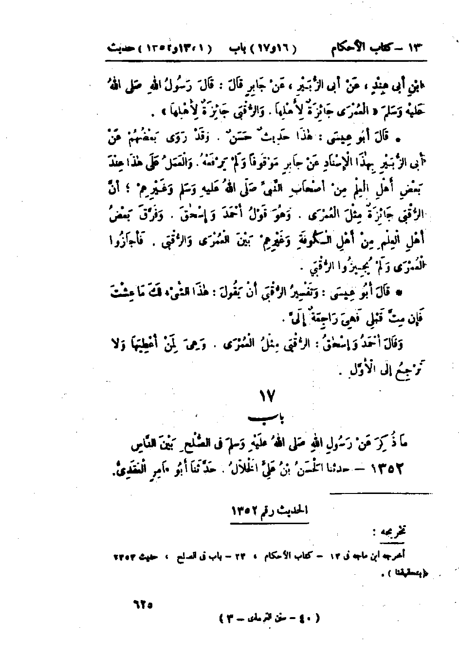 1351 - حَدَّثَنَا أَحْمَدُ بْنُ مَنِيعٍ قَالَ: حَدَّثَنَا هُشَيْمٌ، عَنْ دَاوُدَ -[626]- بْنِ أَبِي هِنْدٍ، عَنْ أَبِي الزُّبَيْرِ، عَنْ جَابِرٍ قَالَ: قَالَ رَسُولُ اللَّهِ صَلَّى اللَّهُ عَلَيْهِ وَسَلَّمَ: «§العُمْرَى جَائِزَةٌ لِأَهْلِهَا، وَالرُّقْبَى جَائِزَةٌ لِأَهْلِهَا»: هَذَا حَدِيثٌ حَسَنٌ وَقَدْ رَوَى بَعْضُهُمْ، عَنْ أَبِي الزُّبَيْرِ بِهَذَا الإِسْنَادِ، عَنْ جَابِرٍ مَوْقُوفًا وَلَمْ يَرْفَعْهُ وَالعَمَلُ عَلَى هَذَا عِنْدَ بَعْضِ أَهْلِ العِلْمِ مِنْ أَصْحَابِ النَّبِيِّ صَلَّى اللَّهُ عَلَيْهِ وَسَلَّمَ وَغَيْرِهِمْ: أَنَّ الرُّقْبَى جَائِزَةٌ مِثْلَ العُمْرَى، وَهُوَ قَوْلُ أَحْمَدَ، وَإِسْحَاقَ، وَفَرَّقَ بَعْضُ أَهْلِ العِلْمِ مِنْ أَهْلِ الكُوفَةِ وَغَيْرِهِمْ، بَيْنَ العُمْرَى، وَالرُّقْبَى، فَأَجَازُوا العُمْرَى، وَلَمْ يُجِيزُوا الرُّقْبَى: وَتَفْسِيرُ الرُّقْبَى: أَنْ يَقُولَ هَذَا الشَّيْءُ لَكَ مَا عِشْتَ، فَإِنْ مُتَّ قَبْلِي فَهِيَ رَاجِعَةٌ إِلَيَّ وَقَالَ أَحْمَدُ، وَإِسْحَاقُ: «الرُّقْبَى مِثْلُ العُمْرَى وَهِيَ لِمَنْ أُعْطِيَهَا، وَلَا تَرْجِعُ إِلَى الأَوَّلِ»