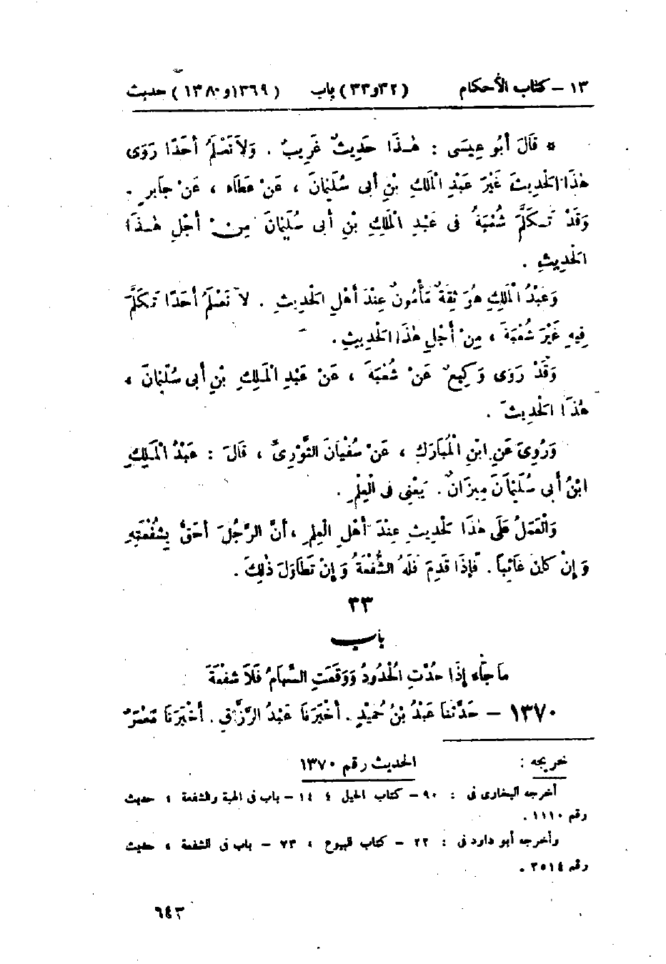 1369 - حَدَّثَنَا قُتَيْبَةُ قَالَ: حَدَّثَنَا خَالِدُ بْنُ عَبْدِ اللَّهِ الوَاسِطِيُّ، عَنْ عَبْدِ المَلِكِ بْنِ أَبِي سُلَيْمَانَ، عَنْ عَطَاءٍ، عَنْ جَابِرٍ قَالَ: قَالَ رَسُولُ اللَّهِ صَلَّى اللَّهُ عَلَيْهِ وَسَلَّمَ: «§الجَارُ أَحَقُّ بِشُفْعَتِهِ، يُنْتَظَرُ بِهِ وَإِنْ كَانَ غَائِبًا، إِذَا كَانَ طَرِيقُهُمَا وَاحِدًا»: -[644]- هَذَا حَدِيثٌ حَسَنٌ غَرِيبٌ، وَلَا نَعْلَمُ أَحَدًا رَوَى هَذَا الحَدِيثَ غَيْرَ عَبْدِ المَلِكِ بْنِ أَبِي سُلَيْمَانَ، عَنْ عَطَاءٍ، عَنْ جَابِرٍ، وَقَدْ تَكَلَّمَ شُعْبَةُ فِي عَبْدِ المَلِكِ بْنِ أَبِي سُلَيْمَانَ مِنْ أَجْلِ هَذَا الحَدِيثِ، وَعَبْدُ المَلِكِ هُوَ ثِقَةٌ مَأْمُونٌ عِنْدَ أَهْلِ الحَدِيثِ، لَا نَعْلَمُ أَحَدًا تَكَلَّمَ فِيهِ غَيْرَ شُعْبَةَ مِنْ أَجْلِ هَذَا الحَدِيثِ وَقَدْ رَوَى وَكِيعٌ، عَنْ شُعْبَةَ، عَنْ عَبْدِ المَلِكِ بْنِ أَبِي سُلَيْمَانَ هَذَا الحَدِيثَ، وَرُوِي عَنْ ابْنِ المُبَارَكِ، عَنْ سُفْيَانَ الثَّوْرِيِّ قَالَ: عَبْدُ المَلِكِ بْنُ أَبِي سُلَيْمَانَ مِيزَانٌ، يَعْنِي: فِي العِلْمِ وَالعَمَلُ عَلَى هَذَا الحَدِيثِ عِنْدَ أَهْلِ العِلْمِ: أَنَّ الرَّجُلَ أَحَقُّ بِشُفْعَتِهِ وَإِنْ كَانَ غَائِبًا، فَإِذَا قَدِمَ فَلَهُ الشُّفْعَةُ وَإِنْ تَطَاوَلَ ذَلِكَ