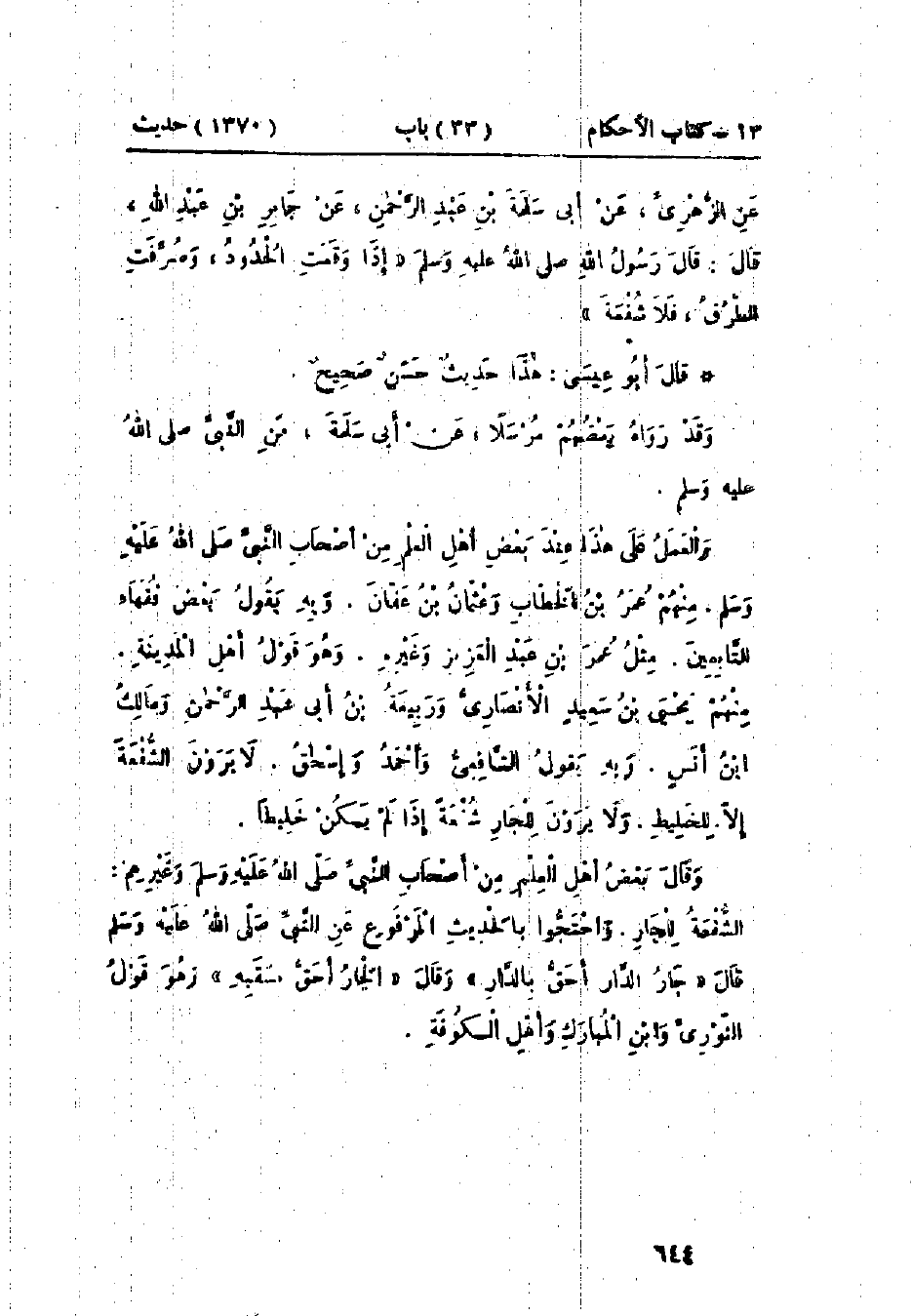 1370 - حَدَّثَنَا عَبْدُ بْنُ حُمَيْدٍ قَالَ: أَخْبَرَنَا عَبْدُ الرَّزَّاقِ قَالَ: أَخْبَرَنَا مَعْمَرٌ، -[645]- عَنْ الزُّهْرِيِّ، عَنْ أَبِي سَلَمَةَ بْنِ عَبْدِ الرَّحْمَنِ، عَنْ جَابِرِ بْنِ عَبْدِ اللَّهِ قَالَ: قَالَ رَسُولُ اللَّهِ صَلَّى اللَّهُ عَلَيْهِ وَسَلَّمَ: «§إِذَا وَقَعَتِ الحُدُودُ، وَصُرِّفَتِ الطُّرُقُ، فَلَا شُفْعَةَ»: هَذَا حَدِيثٌ حَسَنٌ صَحِيحٌ وَقَدْ رَوَاهُ بَعْضُهُمْ مُرْسَلًا، عَنْ أَبِي سَلَمَةَ، عَنِ النَّبِيِّ صَلَّى اللَّهُ عَلَيْهِ وَسَلَّمَ وَالعَمَلُ عَلَى هَذَا عِنْدَ بَعْضِ أَهْلِ العِلْمِ مِنْ أَصْحَابِ النَّبِيِّ صَلَّى اللَّهُ عَلَيْهِ وَسَلَّمَ مِنْهُمْ: عُمَرُ بْنُ الخَطَّابِ، وَعُثْمَانُ بْنُ عَفَّانَ، وَبِهِ يَقُولُ بَعْضُ فُقَهَاءِ التَّابِعِينَ، مِثْلَ: عُمَرَ بْنِ عَبْدِ العَزِيزِ، وَغَيْرِهِ، وَهُوَ قَوْلُ أَهْلِ المَدِينَةِ، مِنْهُمْ: يَحْيَى بْنُ سَعِيدٍ الأَنْصَارِيُّ، وَرَبِيعَةُ بْنُ أَبِي عَبْدِ الرَّحْمَنِ، وَمَالِكُ بْنُ أَنَسٍ، وَبِهِ يَقُولُ الشَّافِعِيُّ، وَأَحْمَدُ، وَإِسْحَاقُ: لَا يَرَوْنَ الشُّفْعَةَ إِلَّا لِلْخَلِيطِ، وَلَا يَرَوْنَ لِلْجَارِ شُفْعَةً إِذَا لَمْ يَكُنْ خَلِيطًا وَقَالَ بَعْضُ أَهْلِ العِلْمِ مِنْ أَصْحَابِ النَّبِيِّ صَلَّى اللَّهُ عَلَيْهِ وَسَلَّمَ وَغَيْرِهِمْ: الشُّفْعَةُ لِلْجَارِ، وَاحْتَجُّوا بِالحَدِيثِ المَرْفُوعِ عَنِ النَّبِيِّ صَلَّى اللَّهُ عَلَيْهِ وَسَلَّمَ قَالَ: «جَارُ الدَّارِ أَحَقُّ بِالدَّارِ»، وَقَالَ: «الجَارُ أَحَقُّ بِسَقَبِهِ»، وَهُوَ قَوْلُ الثَّوْرِيِّ، وَابْنِ المُبَارَكِ، وَأَهْلِ الْكُوفَةِ