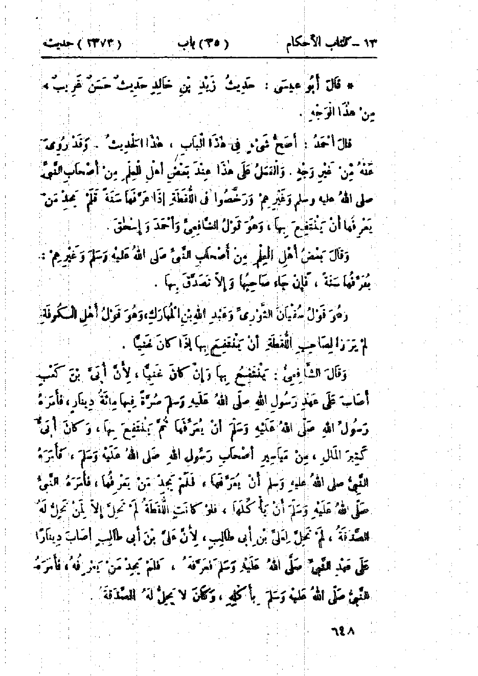 1373 - حَدَّثَنَا مُحَمَّدُ بْنُ بَشَّارٍ قَالَ: حَدَّثَنَا أَبُو بَكْرٍ الحَنَفِيُّ قَالَ: أَخْبَرَنَا الضَّحَّاكُ بْنُ عُثْمَانَ قَالَ: حَدَّثَنِي سَالِمٌ أَبُو النَّضْرِ، عَنْ بُسْرِ بْنِ سَعِيدٍ، عَنْ زَيْدِ بْنِ خَالِدٍ الجُهَنِيِّ، أَنَّ رَسُولَ اللَّهِ صَلَّى اللَّهُ عَلَيْهِ وَسَلَّمَ سُئِلَ عَنِ اللُّقَطَةِ، فَقَالَ: «§عَرِّفْهَا سَنَةً، فَإِنْ اعْتُرِفَتْ فَأَدِّهَا، وَإِلَّا فَاعْرِفْ وِعَاءَهَا وَعِفَاصَهَا وَوِكَاءَهَا وَعَدَدَهَا، ثُمَّ كُلْهَا، فَإِذَا جَاءَ صَاحِبُهَا فَأَدِّهَا» وَفِي البَابِ عَنْ أُبَيِّ بْنِ كَعْبٍ، وَعَبْدِ اللَّهِ بْنِ عَمْرٍو، وَالجَارُودِ بْنِ المُعَلَّى، وَعِيَاضِ بْنِ حِمَارٍ، وَجَرِيرِ بْنِ عَبْدِ اللَّهِ. -[649]- حَدِيثُ زَيْدِ بْنِ خَالِدٍ حَدِيثٌ حَسَنٌ صَحِيحٌ غَرِيبٌ مِنْ هَذَا الوَجْهِ قَالَ أَحْمَدُ: أَصَحُّ شَيْءٍ فِي هَذَا البَابِ هَذَا الحَدِيثُ، وَقَدْ رُوِيَ عَنْهُ مِنْ غَيْرِ وَجْهٍ، وَالعَمَلُ عَلَى هَذَا عِنْدَ بَعْضِ أَهْلِ العِلْمِ مِنْ أَصْحَابِ النَّبِيِّ صَلَّى اللَّهُ عَلَيْهِ وَسَلَّمَ وَغَيْرِهِمْ، وَرَخَّصُوا فِي اللُّقَطَةِ إِذَا عَرَّفَهَا سَنَةً، فَلَمْ يَجِدْ مَنْ يَعْرِفُهَا أَنْ يَنْتَفِعَ بِهَا، وَهُوَ قَوْلُ الشَّافِعِيِّ، وَأَحْمَدَ، وَإِسْحَاقَ، وقَالَ بَعْضُ أَهْلِ العِلْمِ مِنْ أَصْحَابِ النَّبِيِّ صَلَّى اللَّهُ عَلَيْهِ وَسَلَّمَ، وَغَيْرِهِمْ: يُعَرِّفُهَا سَنَةً فَإِنْ جَاءَ صَاحِبُهَا، وَإِلَّا تَصَدَّقَ بِهَا، وَهُوَ قَوْلُ سُفْيَانَ الثَّوْرِيِّ، وَعَبْدِ اللَّهِ بْنِ المُبَارَكِ، وَهُوَ قَوْلُ أَهْلِ الكُوفَةِ: لَمْ يَرَوْا لِصَاحِبِ اللُّقَطَةِ أَنْ يَنْتَفِعَ بِهَا إِذَا كَانَ غَنِيًّا وقَالَ الشَّافِعِيُّ: يَنْتَفِعُ بِهَا وَإِنْ كَانَ غَنِيًّا لِأَنَّ أُبَيَّ بْنَ كَعْبٍ أَصَابَ عَلَى عَهْدِ رَسُولِ اللَّهِ صَلَّى اللَّهُ عَلَيْهِ وَسَلَّمَ صُرَّةً فِيهَا مِائَةُ دِينَارٍ فَأَمَرَهُ رَسُولُ اللَّهِ صَلَّى اللَّهُ عَلَيْهِ وَسَلَّمَ أَنْ يُعَرِّفَهَا ثُمَّ يَنْتَفِعَ بِهَا وَكَانَ أُبَيٌّ كَثِيرَ المَالِ مِنْ مَيَاسِيرِ أَصْحَابِ رَسُولِ اللَّهِ صَلَّى اللَّهُ عَلَيْهِ وَسَلَّمَ فَأَمَرَهُ النَّبِيُّ صَلَّى اللَّهُ عَلَيْهِ وَسَلَّمَ أَنْ يُعَرِّفَهَا فَلَمْ يَجِدْ مَنْ يَعْرِفُهَا، فَأَمَرَهُ النَّبِيُّ صَلَّى اللَّهُ عَلَيْهِ وَسَلَّمَ أَنْ يَأْكُلَهَا، فَلَوْ كَانَتِ اللُّقَطَةُ لَمْ تَحِلَّ إِلَّا لِمَنْ تَحِلُّ لَهُ الصَّدَقَةُ لَمْ تَحِلَّ لِعَلِيِّ بْنِ أَبِي طَالِبٍ لِأَنَّ عَلِيَّ بْنَ أَبِي طَالِبٍ أَصَابَ دِينَارًا عَلَى عَهْدِ النَّبِيِّ صَلَّى اللَّهُ عَلَيْهِ وَسَلَّمَ فَعَرَّفَهُ فَلَمْ يَجِدْ مَنْ يَعْرِفُهُ فَأَمَرَهُ النَّبِيُّ صَلَّى اللَّهُ عَلَيْهِ وَسَلَّمَ بِأَكْلِهِ، وَكَانَ لَا يَحِلُّ لَهُ الصَّدَقَةُ، -[650]- وَقَدْ رَخَّصَ بَعْضُ أَهْلِ العِلْمِ إِذَا كَانَتِ اللُّقَطَةُ يَسِيرَةً أَنْ يَنْتَفِعَ بِهَا، وَلَا يُعَرِّفَهَا، وقَالَ بَعْضُهُمْ: إِذَا كَانَ دُونَ دِينَارٍ يُعَرِّفُهَا قَدْرَ جُمْعَةٍ وَهُوَ قَوْلُ إِسْحَاقَ بْنِ إِبْرَاهِيمَ