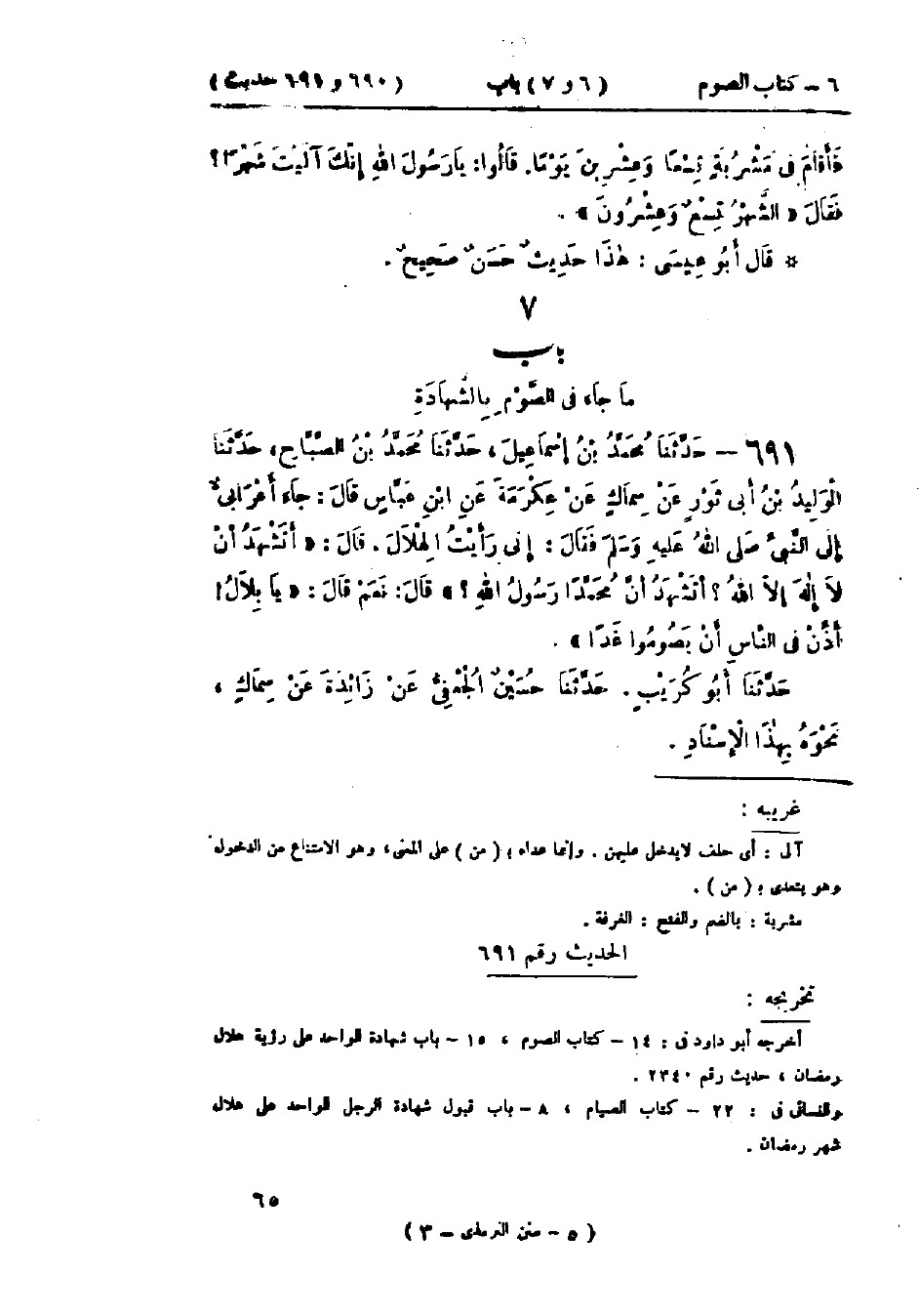691 - حَدَّثَنَا مُحَمَّدُ بْنُ إِسْمَاعِيلَ قَالَ: حَدَّثَنَا مُحَمَّدُ بْنُ الصَّبَّاحِ قَالَ: حَدَّثَنَا الوَلِيدُ بْنُ أَبِي ثَوْرٍ، عَنْ سِمَاكٍ، عَنْ عِكْرِمَةَ، عَنْ ابْنِ عَبَّاسٍ قَالَ: جَاءَ أَعْرَابِيٌّ إِلَى النَّبِيِّ صَلَّى اللَّهُ عَلَيْهِ وَسَلَّمَ، فَقَالَ: إِنِّي رَأَيْتُ الهِلَالَ، قَالَ: «§أَتَشْهَدُ أَنْ لَا إِلَهَ إِلَّا اللَّهُ، أَتَشْهَدُ أَنَّ مُحَمَّدًا رَسُولُ اللَّهِ»، قَالَ: نَعَمْ، قَالَ: «يَا بِلَالُ، أَذِّنْ فِي النَّاسِ أَنْ يَصُومُوا غَدًا» حَدَّثَنَا أَبُو كُرَيْبٍ قَالَ: حَدَّثَنَا حُسَيْنٌ الجُعْفِيُّ، عَنْ زَائِدَةَ، عَنْ سِمَاكٍ، نَحْوَهُ بِهَذَا الإِسْنَادِ. -[66]- «حَدِيثُ ابْنِ عَبَّاسٍ فِيهِ اخْتِلَافٌ» وَرَوَى سُفْيَانُ الثَّوْرِيُّ وَغَيْرُهُ، عَنْ سِمَاكٍ، عَنْ عِكْرِمَةَ، عَنِ النَّبِيِّ صَلَّى اللَّهُ عَلَيْهِ وَسَلَّمَ مُرْسَلًا، «وَأَكْثَرُ أَصْحَابِ سِمَاكٍ رَوَوْا، عَنْ سِمَاكٍ، عَنْ عِكْرِمَةَ، عَنِ النَّبِيِّ صَلَّى اللَّهُ عَلَيْهِ وَسَلَّمَ مُرْسَلًا»، " وَالعَمَلُ عَلَى هَذَا الحَدِيثِ عِنْدَ أَكْثَرِ أَهْلِ العِلْمِ قَالُوا: تُقْبَلُ شَهَادَةُ رَجُلٍ وَاحِدٍ فِي الصِّيَامِ، وَبِهِ يَقُولُ ابْنُ المُبَارَكِ، وَالشَّافِعِيُّ، وَأَحْمَدُ، وَأَهْلِ الْكُوفَةِ "، قَالَ إِسْحَاقُ: «لَا يُصَامُ إِلَّا بِشَهَادَةِ رَجُلَيْنِ»، «وَلَمْ يَخْتَلِفْ أَهْلُ العِلْمِ فِي الإِفْطَارِ أَنَّهُ لَا يُقْبَلُ فِيهِ إِلَّا شَهَادَةُ رَجُلَيْنِ»