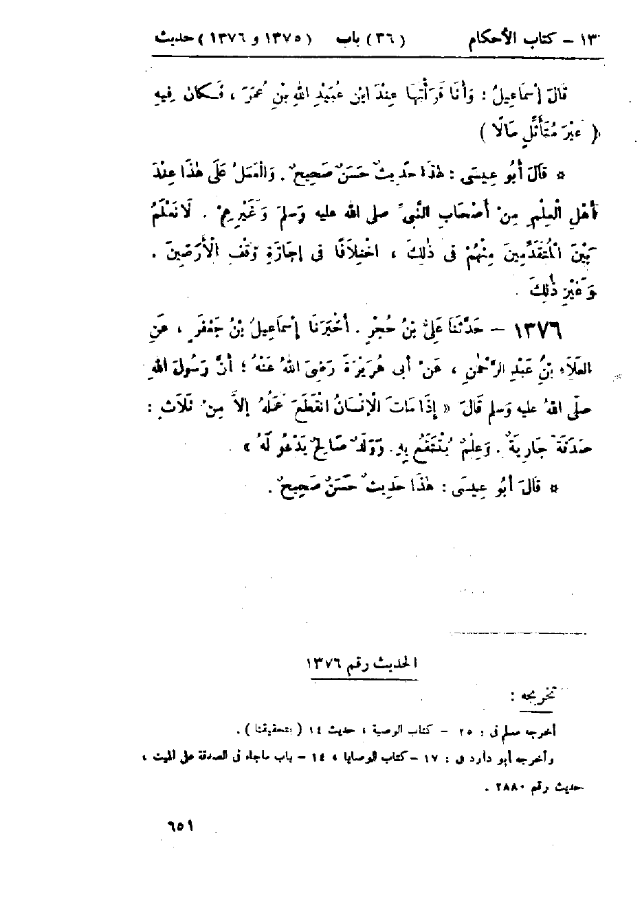 1375 - حَدَّثَنَا عَلِيُّ بْنُ حُجْرٍ قَالَ: حَدَّثَنَا إِسْمَاعِيلُ بْنُ إِبْرَاهِيمَ، عَنْ ابْنِ عَوْنٍ، عَنْ نَافِعٍ، عَنْ ابْنِ عُمَرَ قَالَ: أَصَابَ عُمَرُ أَرْضًا بِخَيْبَرَ، فَقَالَ: يَا رَسُولَ اللَّهِ، أَصَبْتُ مَالًا بِخَيْبَرَ لَمْ أُصِبْ مَالًا قَطُّ أَنْفَسَ عِنْدِي مِنْهُ، فَمَا تَأْمُرُنِي، قَالَ: «§إِنْ شِئْتَ حَبَسْتَ أَصْلَهَا وَتَصَدَّقْتَ بِهَا»، فَتَصَدَّقَ بِهَا عُمَرُ أَنَّهَا لَا يُبَاعُ أَصْلُهَا، وَلَا يُوهَبُ، وَلَا يُورَثُ، تَصَدَّقَ بِهَا فِي الفُقَرَاءِ، وَالقُرْبَى، وَالرِّقَابِ، وَفِي سَبِيلِ اللَّهِ، وَابْنِ السَّبِيلِ، وَالضَّيْفِ، لَا جُنَاحَ عَلَى مَنْ وَلِيَهَا أَنْ يَأْكُلَ مِنْهَا بِالمَعْرُوفِ، أَوْ يُطْعِمَ صَدِيقًا غَيْرَ مُتَمَوِّلٍ فِيهِ قَالَ: فَذَكَرْتُهُ لِمُحَمَّدِ بْنِ سِيرِينَ فَقَالَ: غَيْرَ مُتَأَثِّلٍ مَالًا، قَالَ ابْنُ عَوْنٍ: فَحَدَّثَنِي بِهِ رَجُلٌ آخَرُ أَنَّهُ قَرَأَهَا فِي قِطْعَةِ أَدِيمٍ أَحْمَرَ، غَيْرَ مُتَأَثِّلٍ مَالًا -[652]- قَالَ إِسْمَاعِيلُ: وَأَنَا قَرَأْتُهَا عِنْدَ ابْنِ عُبَيْدِ اللَّهِ بْنِ عُمَرَ فَكَانَ فِيهِ غَيْرَ مُتَأَثِّلٍ مَالًا: هَذَا حَدِيثٌ حَسَنٌ صَحِيحٌ وَالعَمَلُ عَلَى هَذَا عِنْدَ أَهْلِ العِلْمِ مِنْ أَصْحَابِ النَّبِيِّ صَلَّى اللَّهُ عَلَيْهِ وَسَلَّمَ وَغَيْرِهِمْ لَا نَعْلَمُ بَيْنَ المُتَقَدِّمِينَ مِنْهُمْ فِي ذَلِكَ اخْتِلَافًا فِي إِجَازَةِ وَقْفِ الأَرَضِينَ وَغَيْرِ ذَلِكَ