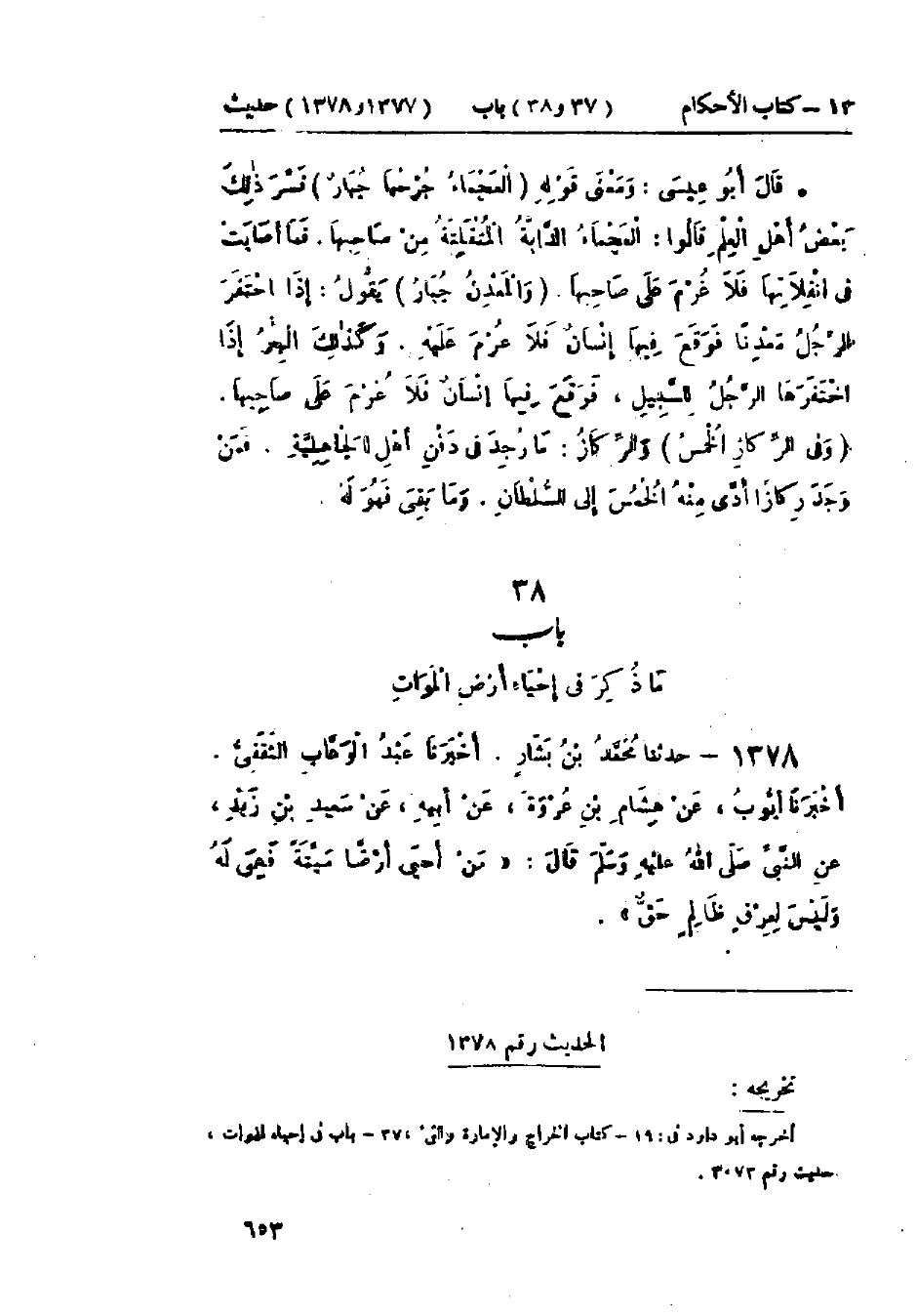 1377 - حَدَّثَنَا أَحْمَدُ بْنُ مَنِيعٍ قَالَ: حَدَّثَنَا سُفْيَانُ، عَنْ الزُّهْرِيِّ، عَنْ سَعِيدِ بْنِ المُسَيِّبِ، عَنْ أَبِي هُرَيْرَةَ قَالَ: قَالَ رَسُولُ اللَّهِ صَلَّى اللَّهُ عَلَيْهِ وَسَلَّمَ: «§العَجْمَاءُ جَرْحُهَا جُبَارٌ، وَالبِئْرُ جُبَارٌ، وَالمَعْدِنُ جُبَارٌ، وَفِي الرِّكَازِ الخُمُسُ» حَدَّثَنَا قُتَيْبَةُ قَالَ: حَدَّثَنَا اللَّيْثُ، عَنْ ابْنِ شِهَابٍ، عَنْ سَعِيدِ بْنِ المُسَيِّبِ، وَأَبِي سَلَمَةَ، عَنْ أَبِي هُرَيْرَةَ، عَنِ النَّبِيِّ صَلَّى اللَّهُ عَلَيْهِ وَسَلَّمَ نَحْوَهُ، وَفِي البَابِ عَنْ جَابِرٍ، وَعَمْرِو بْنِ عَوْفٍ المُزَنِيِّ، وَعُبَادَةَ بْنِ الصَّامِتِ: حَدِيثُ أَبِي هُرَيْرَةَ حَدِيثٌ حَسَنٌ صَحِيحٌ حَدَّثَنَا الأَنْصَارِيُّ، عَنْ مَعْنٍ قَالَ: قَالَ مَالِكُ بْنُ أَنَسٍ: وَتَفْسِيرُ حَدِيثِ النَّبِيِّ صَلَّى اللَّهُ عَلَيْهِ وَسَلَّمَ «العَجْمَاءُ جَرْحُهَا جُبَارٌ»، يَقُولُ: هَدَرٌ لَا دِيَةَ فِيهِ: -[654]- وَمَعْنَى قَوْلِهِ: «العَجْمَاءُ جَرْحُهَا جُبَارٌ»، فَسَّرَ ذَلِكَ بَعْضُ أَهْلِ العِلْمِ قَالُوا: العَجْمَاءُ: الدَّابَّةُ المُنْفَلِتَةُ مِنْ صَاحِبِهَا، فَمَا أَصَابَتْ فِي انْفِلَاتِهَا فَلَا غُرْمَ عَلَى صَاحِبِهَا، وَالمَعْدِنُ جُبَارٌ، يَقُولُ: إِذَا احْتَفَرَ الرَّجُلُ مَعْدِنًا فَوَقَعَ فِيهَا إِنْسَانٌ فَلَا غُرْمَ عَلَيْهِ، وَكَذَلِكَ البِئْرُ إِذَا احْتَفَرَهَا الرَّجُلُ لِلسَّبِيلِ، فَوَقَعَ فِيهَا إِنْسَانٌ فَلَا غُرْمَ عَلَى صَاحِبِهَا، وَفِي الرِّكَازِ الخُمُسُ، وَالرِّكَازُ: مَا وُجِدَ فِي دَفْنِ أَهْلِ الجَاهِلِيَّةِ فَمَنْ وَجَدَ رِكَازًا أَدَّى مِنْهُ الخُمُسَ إِلَى السُّلْطَانِ وَمَا بَقِيَ فَهُوَ لَهُ