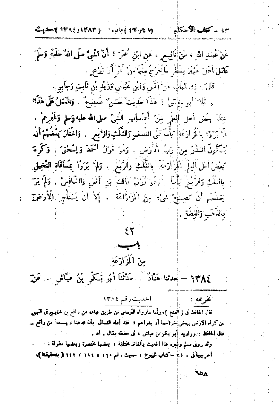 1383 - حَدَّثَنَا إِسْحَاقُ بْنُ مَنْصُورٍ قَالَ: أَخْبَرَنَا يَحْيَى بْنُ سَعِيدٍ، -[659]- عَنْ عُبَيْدِ اللَّهِ، عَنْ نَافِعٍ، عَنْ ابْنِ عُمَرَ، «أَنَّ النَّبِيَّ صَلَّى اللَّهُ عَلَيْهِ وَسَلَّمَ §عَامَلَ أَهْلَ خَيْبَرَ بِشَطْرِ مَا يَخْرُجُ مِنْهَا مِنْ ثَمَرٍ أَوْ زَرْعٍ» وَفِي البَابِ عَنْ أَنَسٍ، وَابْنِ عَبَّاسٍ، وَزَيْدِ بْنِ ثَابِتٍ، وَجَابِرٍ: هَذَا حَدِيثٌ حَسَنٌ صَحِيحٌ وَالعَمَلُ عَلَى هَذَا عِنْدَ بَعْضِ أَهْلِ العِلْمِ مِنْ أَصْحَابِ النَّبِيِّ صَلَّى اللَّهُ عَلَيْهِ وَسَلَّمَ، وَغَيْرِهِمْ: لَمْ يَرَوْا بِالمُزَارَعَةِ بَأْسًا عَلَى النِّصْفِ وَالثُّلُثِ وَالرُّبُعِ، وَاخْتَارَ بَعْضُهُمْ: أَنْ يَكُونَ البَذْرُ مِنْ رَبِّ الأَرْضِ، وَهُوَ قَوْلُ أَحْمَدَ، وَإِسْحَاقَ، وَكَرِهَ بَعْضُ أَهْلِ العِلْمِ المُزَارَعَةَ بِالثُّلُثِ وَالرُّبُعِ، وَلَمْ يَرَوْا بِمُسَاقَاةِ النَّخِيلِ بِالثُّلُثِ وَالرُّبُعِ بَأْسًا، وَهُوَ قَوْلُ مَالِكِ بْنِ أَنَسٍ، وَالشَّافِعِيِّ، وَلَمْ يَرَ بَعْضُهُمْ أَنْ يَصِحَّ شَيْءٌ مِنَ المُزَارَعَةِ إِلَّا أَنْ يَسْتَأْجِرَ الأَرْضَ بِالذَّهَبِ وَالفِضَّةِ