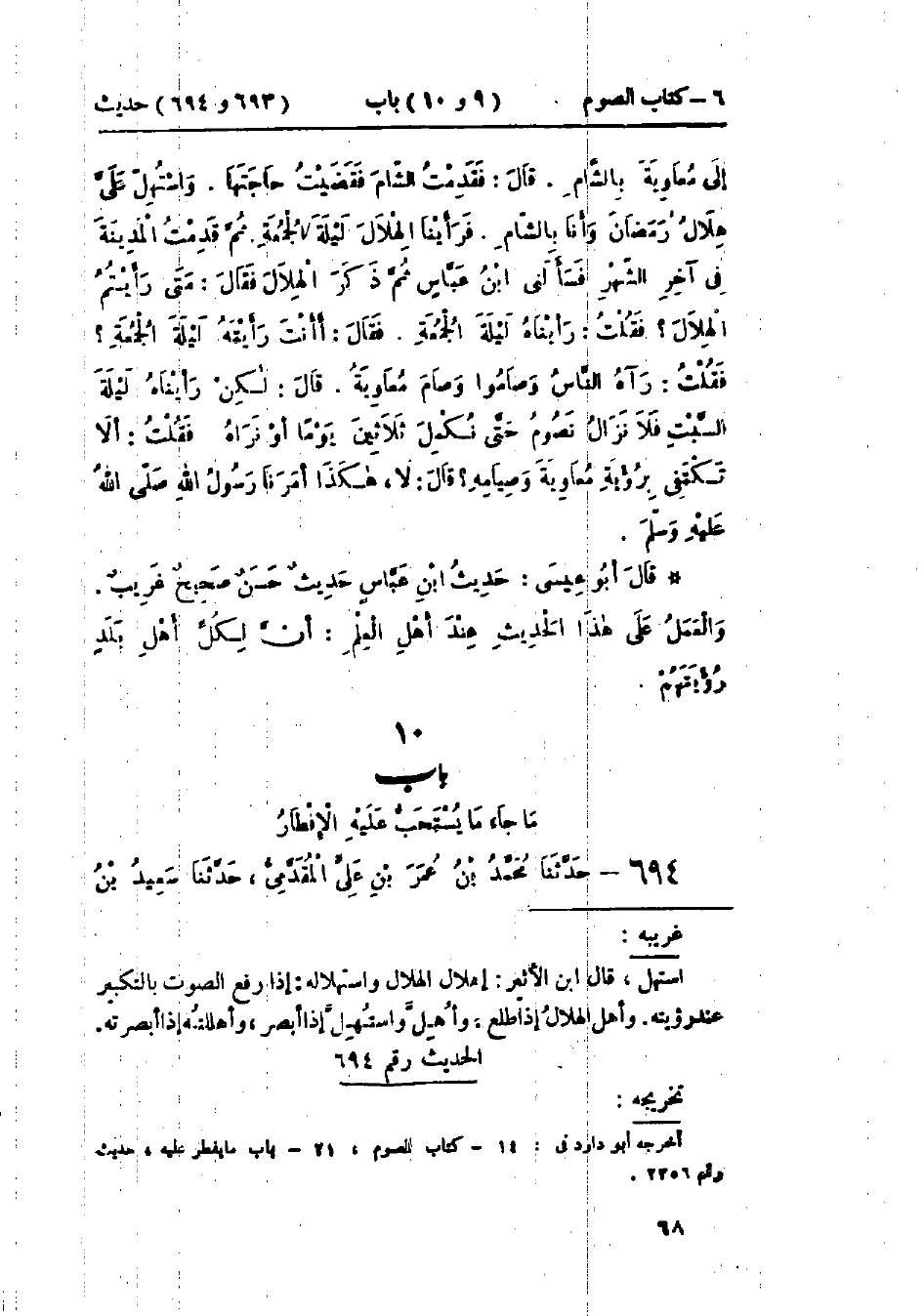 694 - حَدَّثَنَا مُحَمَّدُ بْنُ عُمَرَ بْنِ عَلِيٍّ المُقَدَّمِيُّ قَالَ: حَدَّثَنَا سَعِيدُ بْنُ -[69]- عَامِرٍ قَالَ: حَدَّثَنَا شُعْبَةُ، عَنْ عَبْدِ العَزِيزِ بْنِ صُهَيْبٍ، عَنْ أَنَسِ بْنِ مَالِكٍ قَالَ: قَالَ رَسُولُ اللَّهِ صَلَّى اللَّهُ عَلَيْهِ وَسَلَّمَ: «§مَنْ وَجَدَ تَمْرًا فَلْيُفْطِرْ عَلَيْهِ، وَمَنْ لَا، فَلْيُفْطِرْ عَلَى مَاءٍ، فَإِنَّ المَاءَ طَهُورٌ» وَفِي البَابِ عَنْ سَلْمَانَ بْنِ عَامِرٍ.: «حَدِيثُ أَنَسٍ لَا نَعْلَمُ أَحَدًا رَوَاهُ عَنْ شُعْبَةَ مِثْلَ هَذَا غَيْرَ سَعِيدِ بْنِ عَامِرٍ وَهُوَ حَدِيثٌ غَيْرُ مَحْفُوظٍ، وَلَا نَعْلَمُ لَهُ أَصْلًا مِنْ حَدِيثِ عَبْدِ العَزِيزِ بْنِ صُهَيْبٍ عَنْ أَنَسٍ»، وَقَدْ رَوَى أَصْحَابُ شُعْبَةَ هَذَا الحَدِيثَ، عَنْ شُعْبَةَ، عَنْ عَاصِمٍ الأَحْوَلِ، عَنْ حَفْصَةَ بِنْتِ سِيرِينَ، عَنْ الرَّبَابِ، عَنْ سَلْمَانَ بْنِ عَامِرٍ، عَنِ النَّبِيِّ صَلَّى اللَّهُ عَلَيْهِ وَسَلَّمَ، وَهُوَ أَصَحُّ مِنْ حَدِيثِ سَعِيدِ بْنِ عَامِرٍ، وَهَكَذَا رَوَوْا عَنْ شُعُبَةَ، عَنْ عَاصِمٍ، عَنْ حَفْصَةَ بِنْتِ سِيرِينَ، عَنْ سَلْمَانَ، وَلَمْ يُذْكَرْ فِيهِ شُعْبَةُ، عَنِ الرَّبَابِ وَالصَّحِيحُ مَا رَوَاهُ سُفْيَانُ الثَّوْرِيُّ، وَابْنُ عُيَيْنَةَ، وَغَيْرُ وَاحِدٍ، عَنْ عَاصِمٍ الأَحَوَلِ، عَنْ حَفْصَةَ بِنْتِ سِيرِينَ، عَنِ الرَّبَابِ، عَنْ سَلْمَانَ بْنِ عَامِرٍ، وَابْنُ عَوْنٍ يَقُولُ: عَنْ أُمِّ الرَّائِحِ بِنْتِ صُلَيْعٍ، عَنْ سَلْمَانَ بْنِ عَامِرٍ، «وَالرَّبَابُ هِيَ أُمُّ الرَّائِحِ»