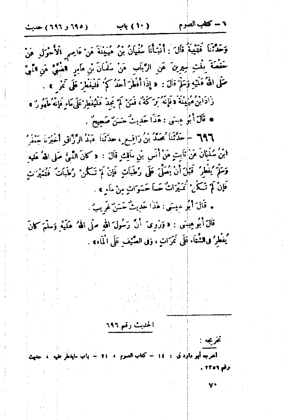 696 - حَدَّثَنَا مُحَمَّدُ بْنُ رَافِعٍ قَالَ: حَدَّثَنَا عَبْدُ الرَّزَّاقِ قَالَ: أَخْبَرَنَا جَعْفَرُ بْنُ سُلَيْمَانَ، عَنْ ثَابِتٍ، عَنْ أَنَسِ بْنِ مَالِكٍ قَالَ: «كَانَ النَّبِيُّ صَلَّى اللَّهُ عَلَيْهِ وَسَلَّمَ §يُفْطِرُ قَبْلَ أَنْ يُصَلِّيَ عَلَى رُطَبَاتٍ، فَإِنْ لَمْ تَكُنْ رُطَبَاتٌ فَتُمَيْرَاتٌ، فَإِنْ لَمْ تَكُنْ تُمَيْرَاتٌ حَسَا حَسَوَاتٍ مِنْ مَاءٍ»: «هَذَا حَدِيثٌ حَسَنٌ غَرِيبٌ»