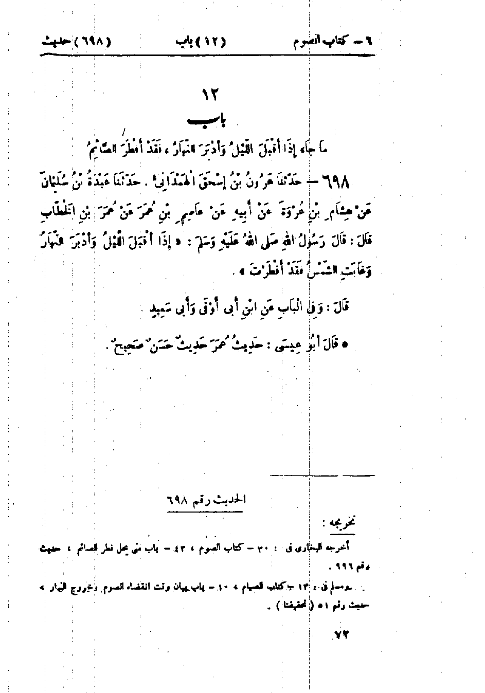 698 - حَدَّثَنَا هَارُونُ بْنُ إِسْحَاقَ الهَمْدَانِيُّ قَالَ: حَدَّثَنَا عَبْدَةُ بْنُ سُلَيْمَانَ، ح وَحَدَّثَنَا أَبُو كُرَيْبٍ، عَنْ أَبِي مُعَاوِيَةَ، ح، وَحَدَّثَنَا مُحَمَّدُ بْنُ مُثَنَّى، عَنْ عَبْدِ اللَّهِ بْنِ دَاوُدَ، عَنْ هِشَامِ بْنِ عُرْوَةَ، عَنْ أَبِيهِ، عَنْ عَاصِمِ بْنِ عُمَرَ، عَنْ عُمَرَ بْنِ الخَطَّابِ قَالَ: قَالَ رَسُولُ اللَّهِ صَلَّى اللَّهُ عَلَيْهِ وَسَلَّمَ: «§إِذَا أَقْبَلَ اللَّيْلُ، وَأَدْبَرَ النَّهَارُ، وَغَابَتِ الشَّمْسُ، فَقَدْ أَفْطَرْتَ» وَفِي البَابِ عَنْ ابْنِ أَبِي أَوْفَى، وَأَبِي سَعِيدٍ.: «حَدِيثُ عُمَرَ حَدِيثٌ صَحِيحٌ»