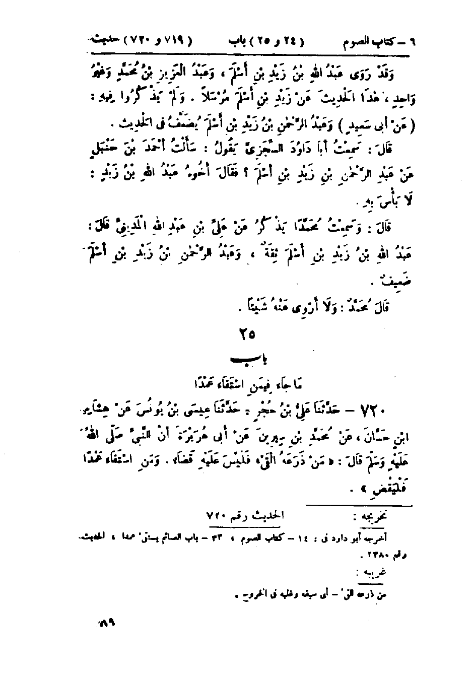 720 - حَدَّثَنَا عَلِيُّ بْنُ حُجْرٍ قَالَ: حَدَّثَنَا عِيسَى بْنُ يُونُسَ، عَنْ هِشَامِ بْنِ حَسَّانَ، عَنْ مُحَمَّدِ بْنِ سِيرِينَ، عَنْ أَبِي هُرَيْرَةَ، أَنَّ النَّبِيَّ صَلَّى اللَّهُ عَلَيْهِ وَسَلَّمَ قَالَ: «§مَنْ ذَرَعَهُ القَيْءُ، فَلَيْسَ عَلَيْهِ قَضَاءٌ، وَمَنْ اسْتَقَاءَ عَمْدًا فَلْيَقْضِ» -[90]- وَفِي البَابِ عَنْ أَبِي الدَّرْدَاءِ، وَثَوْبَانَ، وَفَضَالَةَ بْنِ عُبَيْدٍ.: «حَدِيثُ أَبِي هُرَيْرَةَ حَدِيثٌ حَسَنٌ غَرِيبٌ، لَا نَعْرِفُهُ مِنْ حَدِيثِ هِشَامٍ، عَنْ ابْنِ سِيرِينَ، عَنْ أَبِي هُرَيْرَةَ، عَنِ النَّبِيِّ صَلَّى اللَّهُ عَلَيْهِ وَسَلَّمَ، إِلَّا مِنْ حَدِيثِ عِيسَى بْنِ يُونُسَ»، وقَالَ مُحَمَّدٌ: «لَا أُرَاهُ مَحْفُوظًا».: «وَقَدْ رُوِيَ هَذَا الحَدِيثُ مِنْ غَيْرِ وَجْهٍ عَنْ أَبِي هُرَيْرَةَ عَنِ النَّبِيِّ صَلَّى اللَّهُ عَلَيْهِ وَسَلَّمَ وَلَا يَصِحُّ إِسْنَادُهُ» وَقَدْ رُوِيَ عَنْ أَبِي الدَّرْدَاءِ، وَثَوْبَانَ، وَفَضَالَةَ بْنِ عُبَيْدٍ، «أَنَّ النَّبِيَّ صَلَّى اللَّهُ عَلَيْهِ وَسَلَّمَ قَاءَ فَأَفْطَرَ» وَإِنَّمَا مَعْنَى هَذَا: أَنَّ النَّبِيَّ صَلَّى اللَّهُ عَلَيْهِ وَسَلَّمَ كَانَ صَائِمًا مُتَطَوِّعًا فَقَاءَ فَضَعُفَ فَأَفْطَرَ، لِذَلِكَ هَكَذَا رُوِيَ فِي بَعْضِ الحَدِيثِ مُفَسَّرًا "، وَالعَمَلُ عِنْدَ أَهْلِ العِلْمِ عَلَى حَدِيثِ أَبِي هُرَيْرَةَ، عَنِ النَّبِيِّ صَلَّى اللَّهُ عَلَيْهِ وَسَلَّمَ: «أَنَّ الصَّائِمَ إِذَا ذَرَعَهُ القَيْءُ فَلَا قَضَاءَ عَلَيْهِ، وَإِذَا اسْتَقَاءَ عَمْدًا، فَلْيَقْضِ»، وَبِهِ يَقُولُ سُفْيَانُ الثَّوْرِيُّ، وَالشَّافِعِيُّ، وَأَحْمَدُ، وَإِسْحَاقُ