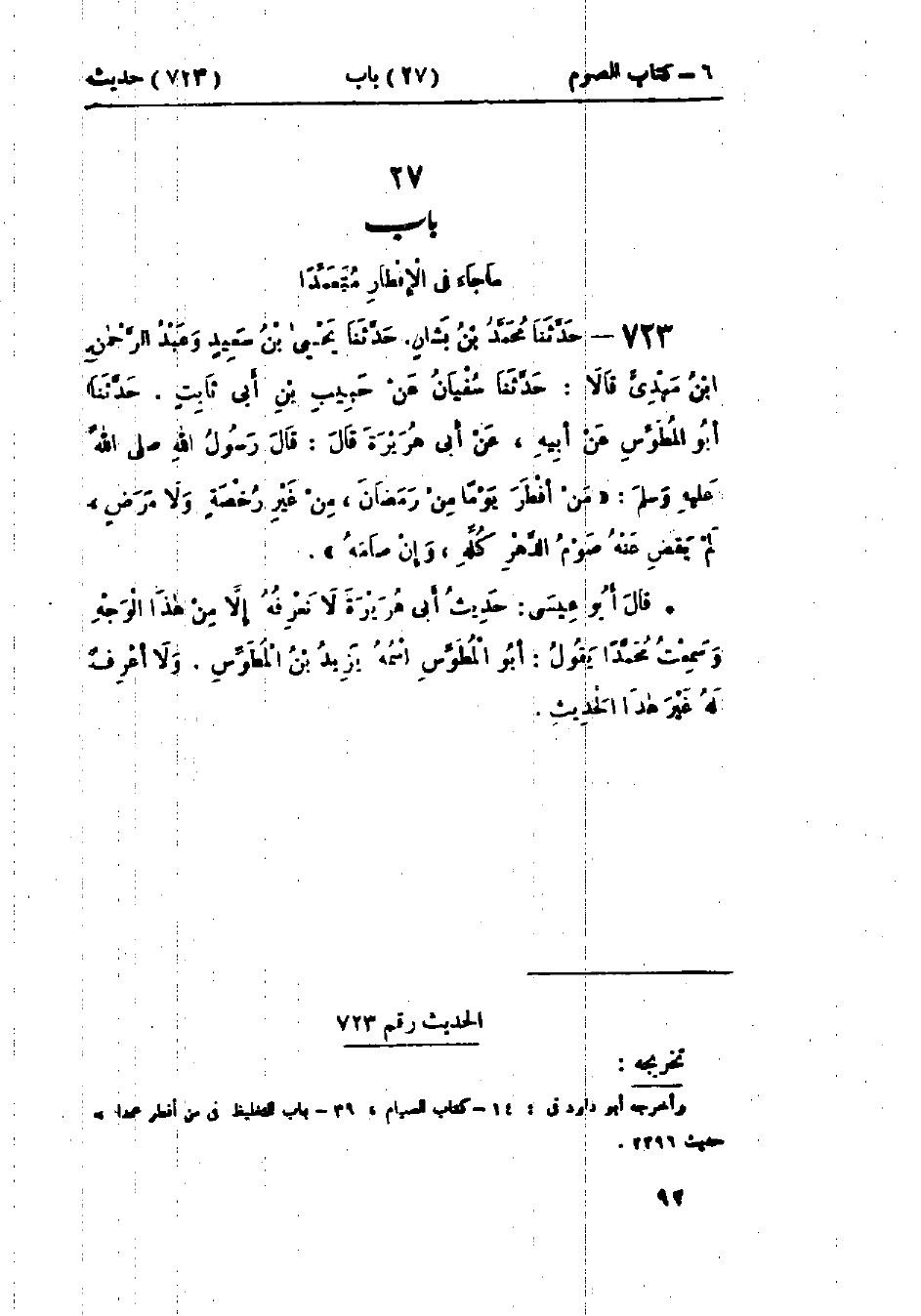 723 - حَدَّثَنَا مُحَمَّدُ بْنُ بَشَّارٍ قَالَ: حَدَّثَنَا يَحْيَى بْنُ سَعِيدٍ، وَعَبْدُ الرَّحْمَنِ بْنُ مَهْدِيٍّ، قَالَا: حَدَّثَنَا سُفْيَانُ، عَنْ حَبِيبِ بْنِ أَبِي ثَابِتٍ قَالَ: حَدَّثَنَا أَبُو المُطَوِّسِ، عَنْ أَبِيهِ، عَنْ أَبِي هُرَيْرَةَ قَالَ: قَالَ رَسُولُ اللَّهِ صَلَّى اللَّهُ عَلَيْهِ وَسَلَّمَ: «§مَنْ أَفْطَرَ يَوْمًا مِنْ رَمَضَانَ مِنْ غَيْرِ رُخْصَةٍ وَلَا مَرَضٍ، لَمْ يَقْضِ عَنْهُ صَوْمُ الدَّهْرِ كُلِّهِ وَإِنْ صَامَهُ»: «حَدِيثُ أَبِي هُرَيْرَةَ لَا نَعْرِفُهُ إِلَّا مِنْ هَذَا الوَجْهِ»، وَسَمِعْتُ مُحَمَّدًا يَقُولُ: " أَبُو المُطَوِّسِ: اسْمُهُ يَزِيدُ بْنُ المُطَوِّسِ وَلَا أَعْرِفُ لَهُ غَيْرَ هَذَا الحَدِيثِ "
