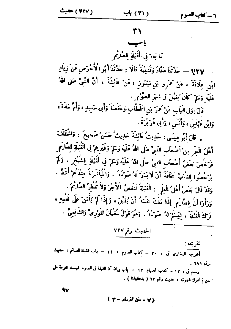 727 - حَدَّثَنَا هَنَّادٌ، وَقُتَيْبَةُ، قَالَا: حَدَّثَنَا أَبُو الأَحْوَصِ، عَنْ زِيَادِ بْنِ عِلَاقَةَ، عَنْ عَمْرِو بْنِ مَيْمُونٍ، عَنْ عَائِشَةَ، «أَنَّ النَّبِيَّ صَلَّى اللَّهُ عَلَيْهِ وَسَلَّمَ كَانَ §يُقَبِّلُ فِي شَهْرِ الصَّوْمِ» وَفِي البَابِ عَنْ عُمَرَ بْنِ الخَطَّابِ، وَحَفْصَةَ، وَأَبِي سَعِيدٍ، وَأُمِّ سَلَمَةَ، وَابْنِ عَبَّاسٍ، وَأَنَسٍ، وَأَبِي هُرَيْرَةَ.: «حَدِيثُ عَائِشَةَ حَدِيثٌ حَسَنٌ صَحِيحٌ» وَاخْتَلَفَ أَهْلُ العِلْمِ مِنْ أَصْحَابِ النَّبِيِّ صَلَّى اللَّهُ عَلَيْهِ وَسَلَّمَ، وَغَيْرِهِمْ فِي القُبْلَةِ لِلصَّائِمِ: فَرَخَّصَ بَعْضُ أَصْحَابِ النَّبِيِّ صَلَّى اللَّهُ عَلَيْهِ وَسَلَّمَ فِي القُبْلَةِ لِلشَّيْخِ، وَلَمْ يُرَخِّصُوا لِلشَّابِّ مَخَافَةَ أَنْ لَا يَسْلَمَ لَهُ صَوْمُهُ، وَالمُبَاشَرَةُ عِنْدَهُمْ أَشَدُّ " وَقَدْ قَالَ بَعْضُ أَهْلِ العِلْمِ: القُبْلَةُ تُنْقِصُ الأَجْرَ وَلَا تُفْطِرُ الصَّائِمَ، وَرَأَوْا أَنَّ لِلصَّائِمِ إِذَا مَلَكَ نَفْسَهُ أَنْ يُقَبِّلَ، وَإِذَا لَمْ يَأْمَنْ عَلَى نَفْسِهِ تَرَكَ القُبْلَةَ لِيَسْلَمَ لَهُ صَوْمُهُ، وَهُوَ قَوْلُ سُفْيَانَ الثَّوْرِيِّ، وَالشَّافِعِيِّ "