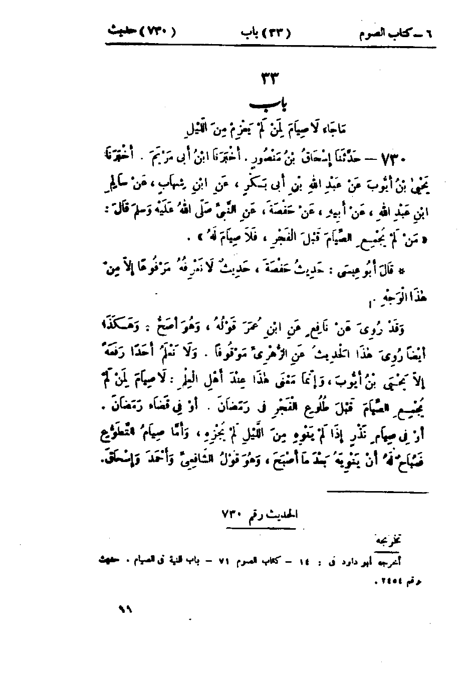 730 - حَدَّثَنَا إِسْحَاقُ بْنُ مَنْصُورٍ قَالَ: أَخْبَرَنَا ابْنُ أَبِي مَرْيَمَ قَالَ: أَخْبَرَنَا يَحْيَى بْنُ أَيُّوبَ، عَنْ عَبْدِ اللَّهِ بْنِ أَبِي بَكْرٍ، عَنْ ابْنِ شِهَابٍ، عَنْ سَالِمِ بْنِ عَبْدِ اللَّهِ، عَنْ أَبِيهِ، عَنْ حَفْصَةَ، عَنْ النَّبِيِّ صَلَّى اللَّهُ عَلَيْهِ وَسَلَّمَ قَالَ: «§مَنْ لَمْ يُجْمِعِ الصِّيَامَ قَبْلَ الفَجْرِ، فَلَا صِيَامَ لَهُ»: «حَدِيثُ حَفْصَةَ حَدِيثٌ لَا نَعْرِفُهُ مَرْفُوعًا إِلَّا مِنْ هَذَا الوَجْهِ»، وَقَدْ رُوِيَ عَنْ نَافِعٍ، عَنْ ابْنِ عُمَرَ قَوْلُهُ، وَهُوَ أَصَحُّ، «وَهَكَذَا أَيْضًا رُوِيَ هَذَا الحَدِيثُ عَنِ الزُّهْرِيِّ مَوْقُوفًا وَلَا نَعْلَمُ أَحَدًا رَفَعَهُ إِلَّا يَحْيَى بْنُ أَيُّوبَ» وَإِنَّمَا مَعْنَى هَذَا عِنْدَ بَعْضِ أَهْلِ العِلْمِ: لَا صِيَامَ لِمَنْ لَمْ يُجْمِعِ الصِّيَامَ قَبْلَ طُلُوعِ الفَجْرِ فِي رَمَضَانَ، أَوْ فِي قَضَاءِ رَمَضَانَ، أَوْ فِي صِيَامِ نَذْرٍ، إِذَا لَمْ يَنْوِهِ مِنَ اللَّيْلِ، لَمْ يُجْزِهِ، وَأَمَّا صِيَامُ التَّطَوُّعِ، فَمُبَاحٌ لَهُ أَنْ يَنْوِيَهُ بَعْدَ مَا أَصْبَحَ، وَهُوَ قَوْلُ الشَّافِعِيِّ، وَأَحْمَدَ، وَإِسْحَاقَ "