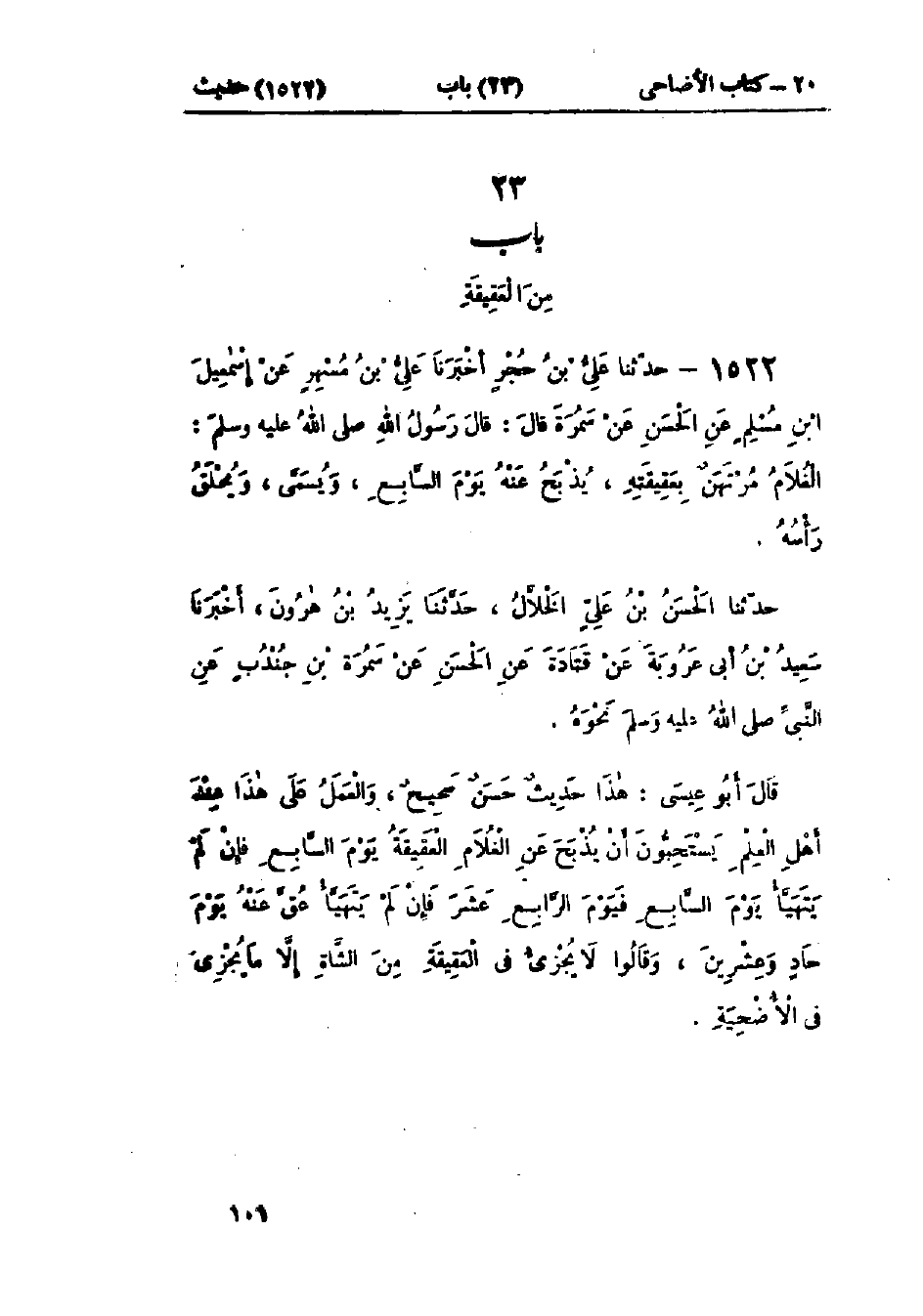 1522 - حَدَّثَنَا عَلِيُّ بْنُ حُجْرٍ قَالَ: أَخْبَرَنَا عَلِيُّ بْنُ مُسْهِرٍ، عَنْ إِسْمَاعِيلَ بْنِ مُسْلِمٍ، عَنْ الحَسَنِ، عَنْ سَمُرَةَ قَالَ: قَالَ رَسُولُ اللَّهِ صَلَّى اللَّهُ عَلَيْهِ وَسَلَّمَ: «§الغُلَامُ مُرْتَهَنٌ بِعَقِيقَتِهِ يُذْبَحُ عَنْهُ يَوْمَ السَّابِعِ، وَيُسَمَّى، وَيُحْلَقُ رَأْسُهُ» حَدَّثَنَا الحَسَنُ بْنُ عَلِيٍّ الخَلَّالُ قَالَ: حَدَّثَنَا يَزِيدُ بْنُ هَارُونَ قَالَ: أَخْبَرَنَا سَعِيدُ بْنُ أَبِي عَرُوبَةَ، عَنْ قَتَادَةَ، عَنِ الحَسَنِ، عَنْ سَمُرَةَ بْنِ جُنْدَبٍ، عَنِ النَّبِيِّ صَلَّى اللَّهُ عَلَيْهِ وَسَلَّمَ نَحْوَهُ.: هَذَا حَدِيثٌ حَسَنٌ صَحِيحٌ وَالعَمَلُ عَلَى هَذَا عِنْدَ أَهْلِ العِلْمِ يَسْتَحِبُّونَ أَنْ يُذْبَحَ عَنِ الغُلَامِ العَقِيقَةُ يَوْمَ السَّابِعِ، فَإِنْ لَمْ يَتَهَيَّأْ يَوْمَ السَّابِعِ فَيَوْمَ الرَّابِعَ عَشَرَ، فَإِنْ لَمْ يَتَهَيَّأْ عُقَّ عَنْهُ يَوْمَ حَادٍ وَعِشْرِينَ، وَقَالُوا: لَا يُجْزِئُ فِي العَقِيقَةِ مِنَ الشَّاةِ إِلَّا مَا يُجْزِئُ فِي الأُضْحِيَّةِ