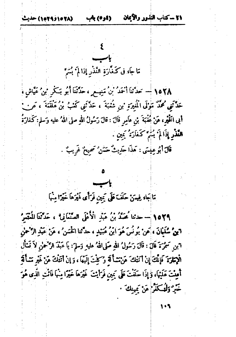 1529 - حَدَّثَنَا مُحَمَّدُ بْنُ عَبْدِ الأَعْلَى الصَّنْعَانِيُّ قَالَ: حَدَّثَنَا المُعْتَمِرُ بْنُ سُلَيْمَانَ، عَنْ يُونُسَ هُوَ ابْنُ عُبَيْدٍ قَالَ: حَدَّثَنَا الحَسَنُ، عَنْ عَبْدِ الرَّحْمَنِ بْنِ سَمُرَةَ قَالَ: قَالَ رَسُولُ اللَّهِ صَلَّى اللَّهُ عَلَيْهِ وَسَلَّمَ: «يَا عَبْدَ الرَّحْمَنِ، §لَا تَسْأَلِ الإِمَارَةَ، فَإِنَّكَ إِنْ أَتَتْكَ عَنْ مَسْأَلَةٍ وُكِلْتَ إِلَيْهَا، وَإِنْ أَتَتْكَ عَنْ غَيْرِ مَسْأَلَةٍ أُعِنْتَ عَلَيْهَا، وَإِذَا حَلَفْتَ عَلَى يَمِينٍ فَرَأَيْتَ غَيْرَهَا خَيْرًا مِنْهَا فَأْتِ الَّذِي هُوَ خَيْرٌ، وَلْتُكَفِّرْ عَنْ يَمِينِكَ» -[107]- وَفِي البَاب عَنْ عَدِيِّ بْنِ حَاتِمٍ، وَأَبِي الدَّرْدَاءِ، وَأَنَسٍ، وَعَائِشَةَ، وَعَبْدِ اللَّهِ بْنِ عَمْرٍو، وَأَبِي هُرَيْرَةَ، وَأُمِّ سَلَمَةَ، وَأَبِي مُوسَى: حَدِيثُ عَبْدِ الرَّحْمَنِ بْنِ سَمُرَةَ حَدِيثٌ حَسَنٌ صَحِيحٌ