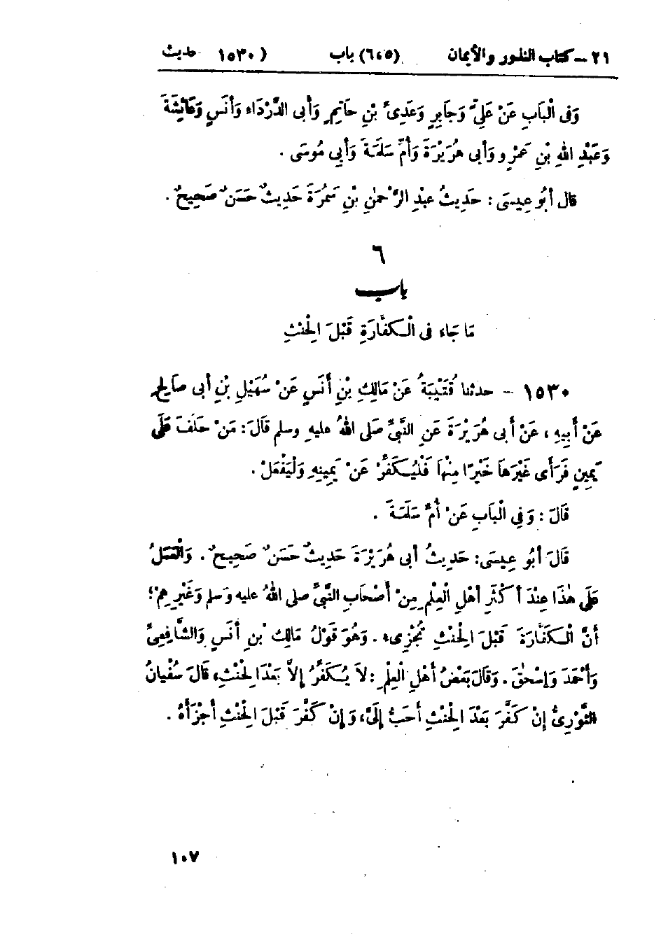 1530 - حَدَّثَنَا قُتَيْبَةُ، عَنْ مَالِكِ بْنِ أَنَسٍ، عَنْ سُهَيْلِ بْنِ أَبِي صَالِحٍ، عَنْ أَبِيهِ، عَنْ أَبِي هُرَيْرَةَ، عَنِ النَّبِيِّ صَلَّى اللَّهُ عَلَيْهِ وَسَلَّمَ قَالَ: «§مَنْ حَلَفَ عَلَى يَمِينٍ، فَرَأَى غَيْرَهَا خَيْرًا مِنْهَا، فَلْيُكَفِّرْ عَنْ يَمِينِهِ وَلْيَفْعَلْ» وَفِي البَاب عَنْ أُمِّ سَلَمَةَ: حَدِيثُ أَبِي هُرَيْرَةَ حَدِيثٌ حَسَنٌ صَحِيحٌ وَالعَمَلُ عَلَى هَذَا عِنْدَ أَكْثَرِ أَهْلِ العِلْمِ مِنْ أَصْحَابِ النَّبِيِّ صَلَّى اللَّهُ عَلَيْهِ وَسَلَّمَ وَغَيْرِهِمْ، أَنَّ الكَفَّارَةَ قَبْلَ الحِنْثِ تُجْزِئُ، وَهُوَ قَوْلُ مَالِكِ بْنِ أَنَسٍ، وَالشَّافِعِيِّ، وَأَحْمَدَ، وَإِسْحَاقَ وقَالَ بَعْضُ أَهْلِ العِلْمِ: لَا يُكَفِّرُ إِلَّا بَعْدَ الحِنْثِ قَالَ سُفْيَانُ الثَّوْرِيُّ: إِنْ كَفَّرَ بَعْدَ الحِنْثِ أَحَبُّ إِلَيَّ، وَإِنْ كَفَّرَ قَبْلَ الحِنْثِ أَجْزَأَهُ