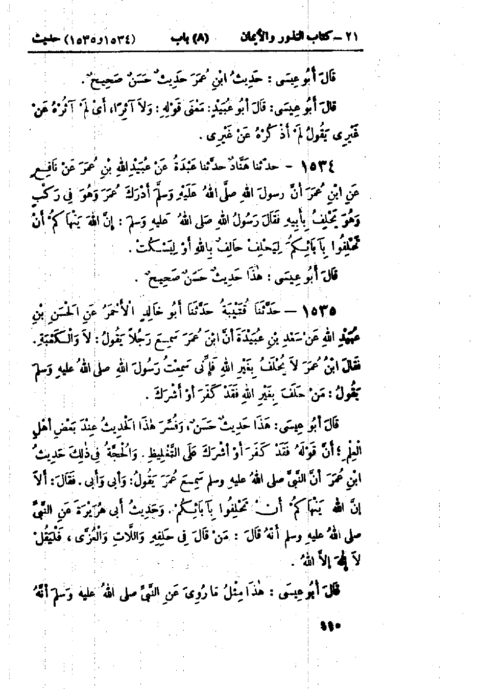 1535 - حَدَّثَنَا قُتَيْبَةُ قَالَ: حَدَّثَنَا أَبُو خَالِدٍ الأَحْمَرُ، عَنْ الحَسَنِ بْنِ عُبَيْدِ اللَّهِ، عَنْ سَعْدِ بْنِ عُبَيْدَةَ، أَنَّ ابْنَ عُمَرَ سَمِعَ رَجُلًا يَقُولُ: لَا وَالكَعْبَةِ، فَقَالَ ابْنُ عُمَرَ: لَا يُحْلَفُ بِغَيْرِ اللَّهِ، فَإِنِّي سَمِعْتُ رَسُولَ اللَّهِ صَلَّى اللَّهُ عَلَيْهِ وَسَلَّمَ يَقُولُ: «§مَنْ حَلَفَ بِغَيْرِ اللَّهِ فَقَدْ كَفَرَ أَوْ أَشْرَكَ»: هَذَا حَدِيثٌ حَسَنٌ وَفُسِّرَ هَذَا الحَدِيثُ عِنْدَ بَعْضِ أَهْلِ العِلْمِ: أَنَّ قَوْلَهُ «فَقَدْ كَفَرَ أَوْ أَشْرَكَ» عَلَى التَّغْلِيظِ، وَالحُجَّةُ فِي ذَلِكَ حَدِيثُ ابْنِ عُمَرَ، أَنَّ النَّبِيَّ صَلَّى اللَّهُ عَلَيْهِ وَسَلَّمَ سَمِعَ عُمَرَ يَقُولُ: وَأَبِي وَأَبِي، فَقَالَ: «أَلَا إِنَّ اللَّهَ يَنْهَاكُمْ أَنْ تَحْلِفُوا بِآبَائِكُمْ»، وَحَدِيثُ أَبِي هُرَيْرَةَ، عَنِ النَّبِيِّ صَلَّى اللَّهُ عَلَيْهِ وَسَلَّمَ أَنَّهُ قَالَ: " مَنْ قَالَ فِي حَلِفِهِ وَاللَّاتِ، وَالعُزَّى فَلْيَقُلْ: لَا إِلَهَ إِلَّا اللَّهُ ": هَذَا مِثْلُ مَا رُوِيَ عَنِ النَّبِيِّ صَلَّى اللَّهُ عَلَيْهِ وَسَلَّمَ أَنَّهُ -[111]- قَالَ: «إِنَّ الرِّيَاءَ شِرْكٌ» وَقَدْ فَسَّرَ بَعْضُ أَهْلِ العِلْمِ هَذِهِ الآيَةَ: {فَمَنْ كَانَ يَرْجُو لِقَاءَ رَبِّهِ فَلْيَعْمَلْ عَمَلًا صَالِحًا} [الكهف: 110] الآيَةَ، قَالَ: لَا يُرَائِي