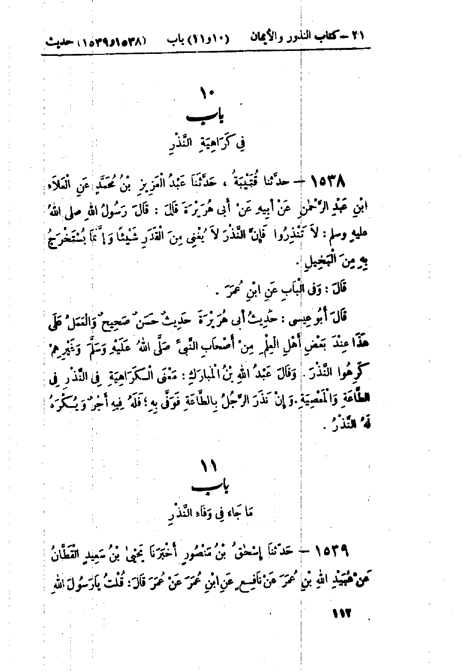 1538 - حَدَّثَنَا قُتَيْبَةُ قَالَ: حَدَّثَنَا عَبْدُ العَزِيزِ بْنُ مُحَمَّدٍ، عَنْ العَلَاءِ بْنِ عَبْدِ الرَّحْمَنِ، عَنْ أَبِيهِ، عَنْ أَبِي هُرَيْرَةَ قَالَ: قَالَ رَسُولُ اللَّهِ صَلَّى اللَّهُ عَلَيْهِ وَسَلَّمَ: «§لَا تَنْذِرُوا فَإِنَّ النَّذْرَ لَا يُغْنِي مِنَ القَدَرِ شَيْئًا، وَإِنَّمَا يُسْتَخْرَجُ بِهِ مِنَ البَخِيلِ» وَفِي البَاب عَنْ ابْنِ عُمَرَ: حَدِيثُ أَبِي هُرَيْرَةَ حَدِيثٌ حَسَنٌ صَحِيحٌ وَالعَمَلُ عَلَى هَذَا عِنْدَ بَعْضِ أَهْلِ العِلْمِ مِنْ أَصْحَابِ النَّبِيِّ صَلَّى اللَّهُ عَلَيْهِ وَسَلَّمَ وَغَيْرِهِمْ كَرِهُوا النَّذْرَ وقَالَ عَبْدُ اللَّهِ بْنُ المُبَارَكِ: مَعْنَى الكَرَاهِيَةِ فِي النَّذْرِ فِي الطَّاعَةِ وَالمَعْصِيَةِ، وَإِنْ نَذَرَ الرَّجُلُ بِالطَّاعَةِ فَوَفَّى بِهِ فَلَهُ فِيهِ أَجْرٌ وَيُكْرَهُ لَهُ النَّذْرُ