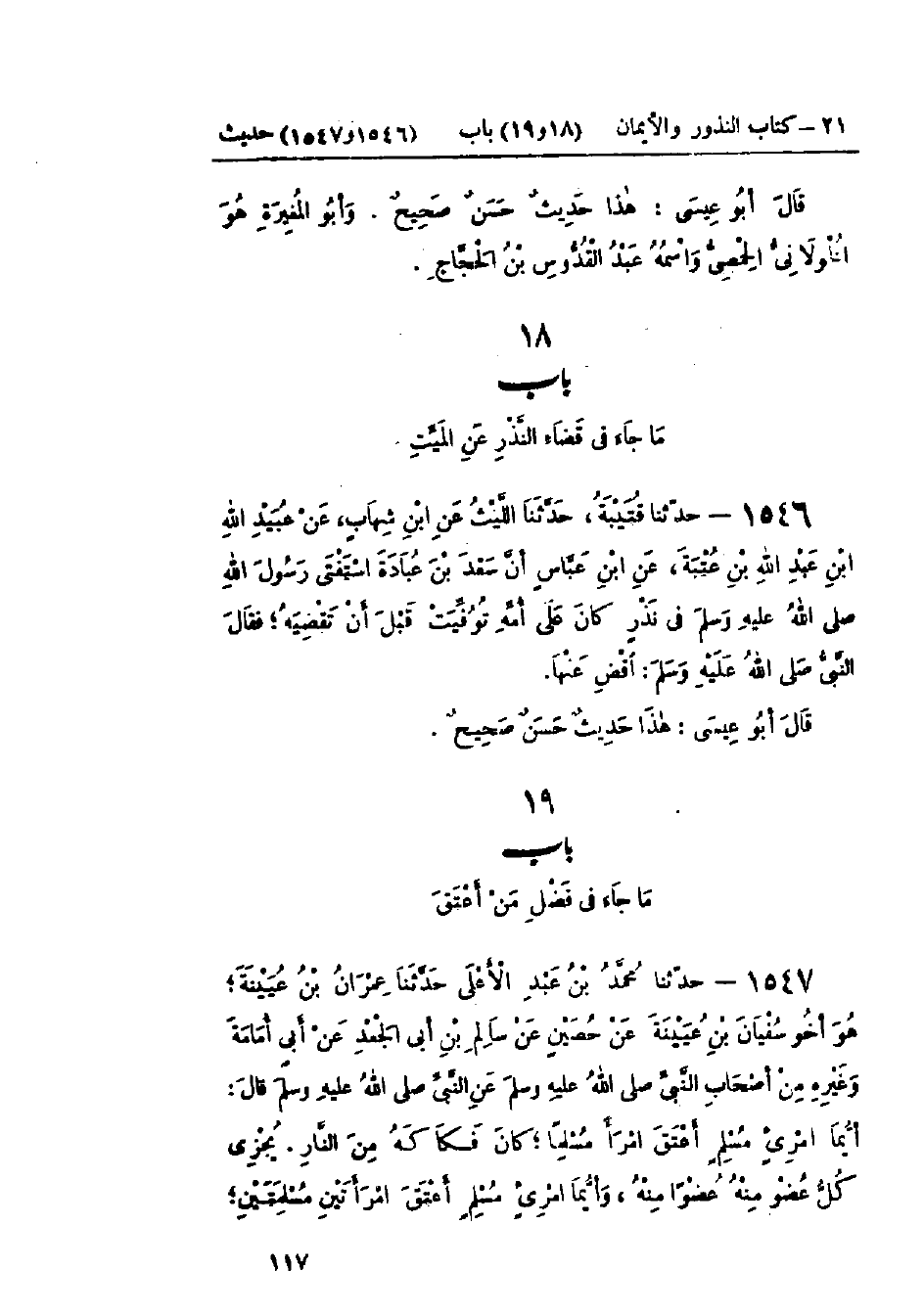 1547 - حَدَّثَنَا مُحَمَّدُ بْنُ عَبْدِ الأَعْلَى قَالَ: حَدَّثَنَا عِمْرَانُ بْنُ عُيَيْنَةَ، وَهُوَ أَخُو سُفْيَانَ بْنِ عُيَيْنَةَ، عَنْ حُصَيْنٍ، عَنْ سَالِمِ بْنِ أَبِي الجَعْدِ، عَنْ أَبِي أُمَامَةَ، وَغَيْرِهِ مِنْ أَصْحَابِ النَّبِيِّ صَلَّى اللَّهُ عَلَيْهِ وَسَلَّمَ، عَنِ النَّبِيِّ صَلَّى اللَّهُ عَلَيْهِ وَسَلَّمَ قَالَ: «§أَيُّمَا امْرِئٍ مُسْلِمٍ، أَعْتَقَ امْرَأً مُسْلِمًا، كَانَ فَكَاكَهُ مِنَ النَّارِ، يُجْزِي كُلُّ عُضْوٍ مِنْهُ عُضْوًا مِنْهُ، وَأَيُّمَا امْرِئٍ مُسْلِمٍ، أَعْتَقَ امْرَأَتَيْنِ مُسْلِمَتَيْنِ، -[118]- كَانَتَا فَكَاكَهُ مِنَ النَّارِ، يُجْزِي كُلُّ عُضْوٍ مِنْهُمَا عُضْوًا مِنْهُ، وَأَيُّمَا امْرَأَةٍ مُسْلِمَةٍ، أَعْتَقَتْ امْرَأَةً مُسْلِمَةً، كَانَتْ فَكَاكَهَا مِنَ النَّارِ، يُجْزِي كُلُّ عُضْوٍ مِنْهَا عُضْوًا مِنْهَا»: هَذَا حَدِيثٌ حَسَنٌ صَحِيحٌ غَرِيبٌ مِنْ هَذَا الوَجْهِ: وَفِي الحَدِيثِ مَا يَدُلُّ عَلَى أَنَّ عِتْقَ الذُّكُورِ لِلرِّجَالِ أَفْضَلُ مِنْ عِتْقِ الإِنَاثِ لِقَوْلِ رَسُولِ اللَّهِ صَلَّى اللَّهُ عَلَيْهِ وَسَلَّمَ: «مَنْ أَعْتَقَ امْرَأً مُسْلِمًا كَانَ فَكَاكَهُ مِنَ النَّارِ، يُجْزِي كُلُّ عُضْوٍ مِنْهُ عُضْوًا مِنْهُ». الْحَدِيثُ صَحَّ فِي طُرُقِهِ