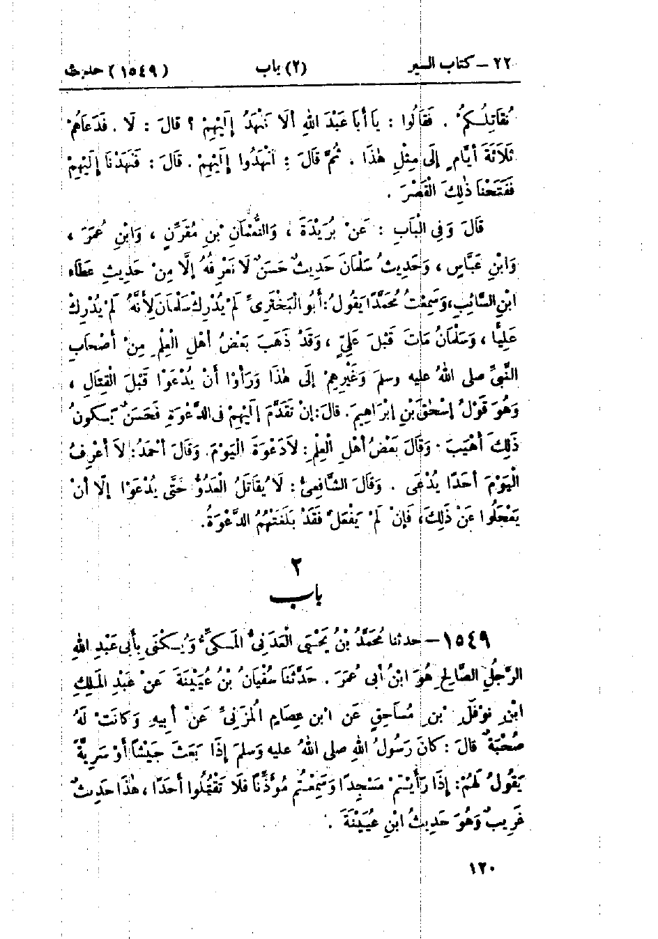 1549 - حَدَّثَنَا مُحَمَّدُ بْنُ يَحْيَى العَدَنِيُّ المَكِّيُّ وَيُكْنَى بِأَبِي عَبْدِ اللَّهِ الرَّجُلِ الصَّالِحِ هُوَ ابْنُ أَبِي عُمَرَ قَالَ: حَدَّثَنَا سُفْيَانُ بْنُ عُيَيْنَةَ، عَنْ عَبْدِ المَلِكِ بْنِ نَوْفَلِ بْنِ مُسَاحِقٍ، عَنْ ابْنِ عِصَامٍ المُزَنِيِّ، عَنْ أَبِيهِ وَكَانَتْ لَهُ صُحْبَةٌ، قَالَ: كَانَ رَسُولُ اللَّهِ صَلَّى اللَّهُ عَلَيْهِ وَسَلَّمَ إِذَا بَعَثَ جَيْشًا أَوْ سَرِيَّةً يَقُولُ لَهُمْ: «§إِذَا رَأَيْتُمْ مَسْجِدًا، أَوْ سَمِعْتُمْ مُؤَذِّنًا، فَلَا تَقْتُلُوا أَحَدًا» هَذَا حَدِيثٌ حَسَنٌ غَرِيبٌ، وَهُوَ حَدِيثُ ابْنِ عُيَيْنَةَ