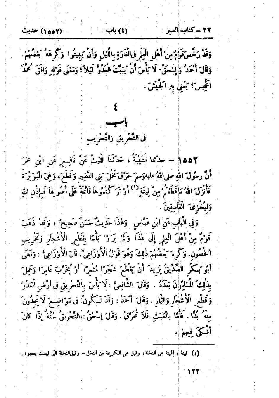 1552 - حَدَّثَنَا قُتَيْبَةُ قَالَ: حَدَّثَنَا اللَّيْثُ، عَنْ نَافِعٍ، عَنْ ابْنِ عُمَرَ، أَنَّ رَسُولَ اللَّهِ صَلَّى اللَّهُ عَلَيْهِ وَسَلَّمَ " §حَرَّقَ نَخْلَ بَنِي النَّضِيرِ وَقَطَعَ، وَهِيَ البُوَيْرَةُ، فَأَنْزَلَ اللَّهُ: {مَا قَطَعْتُمْ مِنْ لِينَةٍ أَوْ تَرَكْتُمُوهَا قَائِمَةً عَلَى أُصُولِهَا فَبِإِذْنِ اللَّهِ وَلِيُخْزِيَ الفَاسِقِينَ} [الحشر: 5] " وَفِي البَاب عَنْ ابْنِ عَبَّاسٍ وَهَذَا حَدِيثٌ حَسَنٌ صَحِيحٌ وَقَدْ ذَهَبَ قَوْمٌ مِنْ أَهْلِ العِلْمِ إِلَى هَذَا، وَلَمْ يَرَوْا بَأْسًا بِقَطْعِ الأَشْجَارِ، وَتَخْرِيبِ الحُصُونِ، وَكَرِهَ بَعْضُهُمْ ذَلِكَ، وَهُوَ قَوْلُ الأَوْزَاعِيِّ قَالَ الأَوْزَاعِيُّ: وَنَهَى أَبُو بَكْرٍ الصِّدِّيقُ أَنْ يَقْطَعَ شَجَرًا مُثْمِرًا، أَوْ يُخَرِّبَ عَامِرًا، وَعَمِلَ بِذَلِكَ المُسْلِمُونَ بَعْدَهُ وقَالَ الشَّافِعِيُّ: لَا بَأْسَ بِالتَّحْرِيقِ فِي أَرْضِ العَدُوِّ وَقَطْعِ الأَشْجَارِ وَالثِّمَارِ وقَالَ أَحْمَدُ: وَقَدْ تَكُونُ فِي مَوَاضِعَ لَا يَجِدُونَ مِنْهُ بُدًّا، فَأَمَّا بِالعَبَثِ فَلَا تُحَرَّقْ وقَالَ إِسْحَاقُ: التَّحْرِيقُ سُنَّةٌ إِذَا كَانَ أَنْكَى فِيهِمْ