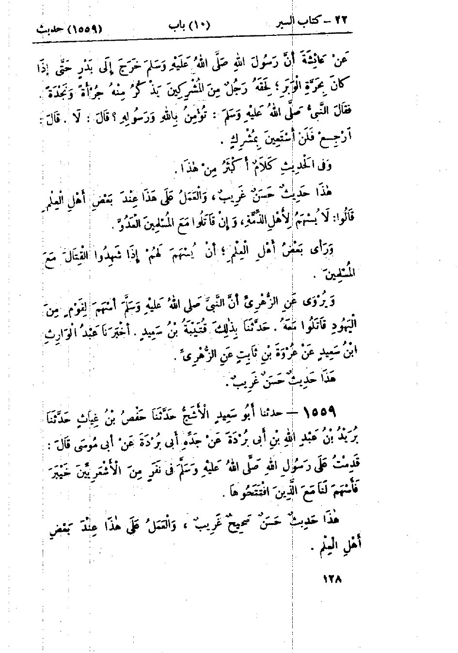 1559 - حَدَّثَنَا أَبُو سَعِيدٍ الأَشَجُّ قَالَ: حَدَّثَنَا حَفْصُ بْنُ غِيَاثٍ قَالَ: حَدَّثَنَا بُرَيْدُ بْنُ عَبْدِ اللَّهِ بْنِ أَبِي بُرْدَةَ، عَنْ جَدِّهِ أَبِي بُرْدَةَ، عَنْ أَبِي مُوسَى قَالَ: «قَدِمْتُ عَلَى رَسُولِ اللَّهِ صَلَّى اللَّهُ عَلَيْهِ وَسَلَّمَ فِي نَفَرٍ مِنَ الأَشْعَرِيِّينَ خَيْبَرَ، §فَأَسْهَمَ لَنَا مَعَ الَّذِينَ افْتَتَحُوهَا» هَذَا حَدِيثٌ حَسَنٌ صَحِيحٌ غَرِيبٌ، وَالعَمَلُ عَلَى هَذَا عِنْدَ بَعْضِ أَهْلِ العِلْمِ -[129]- قَالَ الأَوْزَاعِيُّ: مَنْ لَحِقَ بِالمُسْلِمِينَ قَبْلَ أَنْ يُسْهَمَ لِلْخَيْلِ أُسْهِمَ لَهُ وَبُرَيْدٌ يُكْنَى أَبَا بُرْدَةَ وَهُوَ ثِقَةٌ، وَرَوَى عَنْهُ سُفْيَانُ الثَّوْرِيُّ، وَابْنُ عُيَيْنَةَ، وَغَيْرُهُمَا