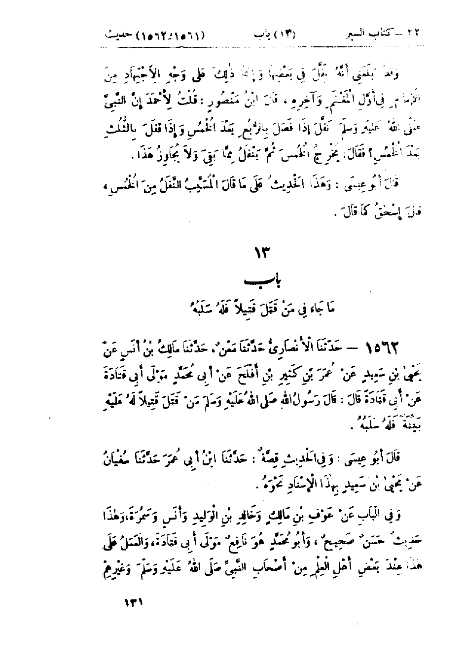 1562 - حَدَّثَنَا الأَنْصَارِيُّ قَالَ: حَدَّثَنَا مَعْنٌ قَالَ: حَدَّثَنَا مَالِكُ بْنُ أَنَسٍ، عَنْ يَحْيَى بْنِ سَعِيدٍ، عَنْ عُمَرَ بْنِ كَثِيرِ بْنِ أَفْلَحَ، عَنْ أَبِي مُحَمَّدٍ، مَوْلَى أَبِي قَتَادَةَ، عَنْ أَبِي قَتَادَةَ قَالَ: قَالَ رَسُولُ اللَّهِ صَلَّى اللَّهُ عَلَيْهِ وَسَلَّمَ: «§مَنْ قَتَلَ قَتِيلًا لَهُ عَلَيْهِ بَيِّنَةٌ فَلَهُ سَلَبُهُ»: «وَفِي الحَدِيثِ قِصَّةٌ» حَدَّثَنَا ابْنُ أَبِي عُمَرَ قَالَ: حَدَّثَنَا سُفْيَانُ بْنُ عُيَيْنَةَ، عَنْ يَحْيَى بْنِ سَعِيدٍ، بِهَذَا الإِسْنَادِ نَحْوَهُ وَفِي البَاب عَنْ عَوْفِ بْنِ مَالِكٍ، وَخَالِدِ بْنِ الوَلِيدِ، وَأَنَسٍ، وَسَمُرَةَ وَهَذَا حَدِيثٌ حَسَنٌ صَحِيحٌ وَأَبُو مُحَمَّدٍ هُوَ نَافِعٌ مَوْلَى أَبِي قَتَادَةَ، وَالعَمَلُ عَلَى هَذَا عِنْدَ بَعْضِ أَهْلِ العِلْمِ مِنْ أَصْحَابِ النَّبِيِّ صَلَّى اللَّهُ عَلَيْهِ وَسَلَّمَ وَغَيْرِهِمْ، -[132]- وَهُوَ قَوْلُ الأَوْزَاعِيِّ، وَالشَّافِعِيِّ، وَأَحْمَدَ وقَالَ بَعْضُ أَهْلِ العِلْمِ: لِلإِمَامِ أَنْ يُخْرِجَ مِنَ السَّلَبِ الخُمُسَ وقَالَ الثَّوْرِيُّ: النَّفَلُ أَنْ يَقُولَ: الإِمَامُ مَنْ أَصَابَ شَيْئًا فَهُوَ لَهُ، وَمَنْ قَتَلَ قَتِيلًا فَلَهُ سَلَبُهُ، فَهُوَ جَائِزٌ، وَلَيْسَ فِيهِ الخُمُسُ وقَالَ إِسْحَاقُ: السَّلَبُ لِلْقَاتِلِ، إِلَّا أَنْ يَكُونَ شَيْئًا كَثِيرًا فَرَأَى الإِمَامُ أَنْ يُخْرِجَ مِنْهُ الخُمُسَ، كَمَا فَعَلَ عُمَرُ بْنُ الخَطَّابِ