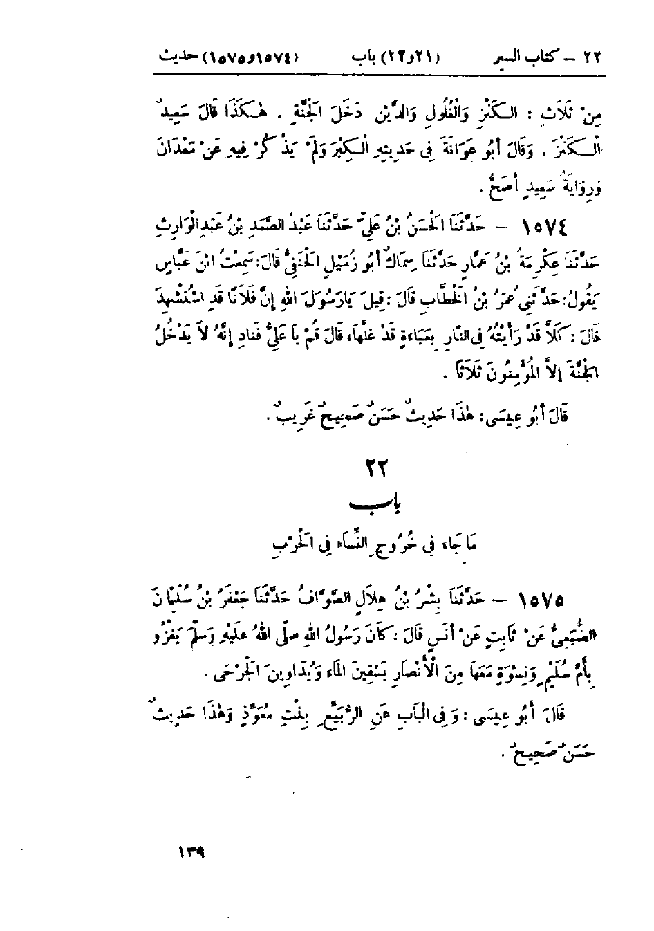 1575 - حَدَّثَنَا بِشْرُ بْنُ هِلَالٍ الصَّوَّافُ قَالَ: حَدَّثَنَا جَعْفَرُ بْنُ سُلَيْمَانَ الضُّبَعِيُّ، عَنْ ثَابِتٍ، عَنْ أَنَسٍ، قَالَ: «كَانَ رَسُولُ اللَّهِ صَلَّى اللَّهُ عَلَيْهِ وَسَلَّمَ §يَغْزُو بِأُمِّ سُلَيْمٍ وَنِسْوَةٍ مَعَهَا مِنَ الأَنْصَارِ يَسْقِينَ المَاءَ وَيُدَاوِينَ الجَرْحَى»: وَفِي البَاب عَنْ الرُّبَيِّعِ بِنْتِ مُعَوِّذٍ وَهَذَا حَدِيثٌ حَسَنٌ صَحِيحٌ