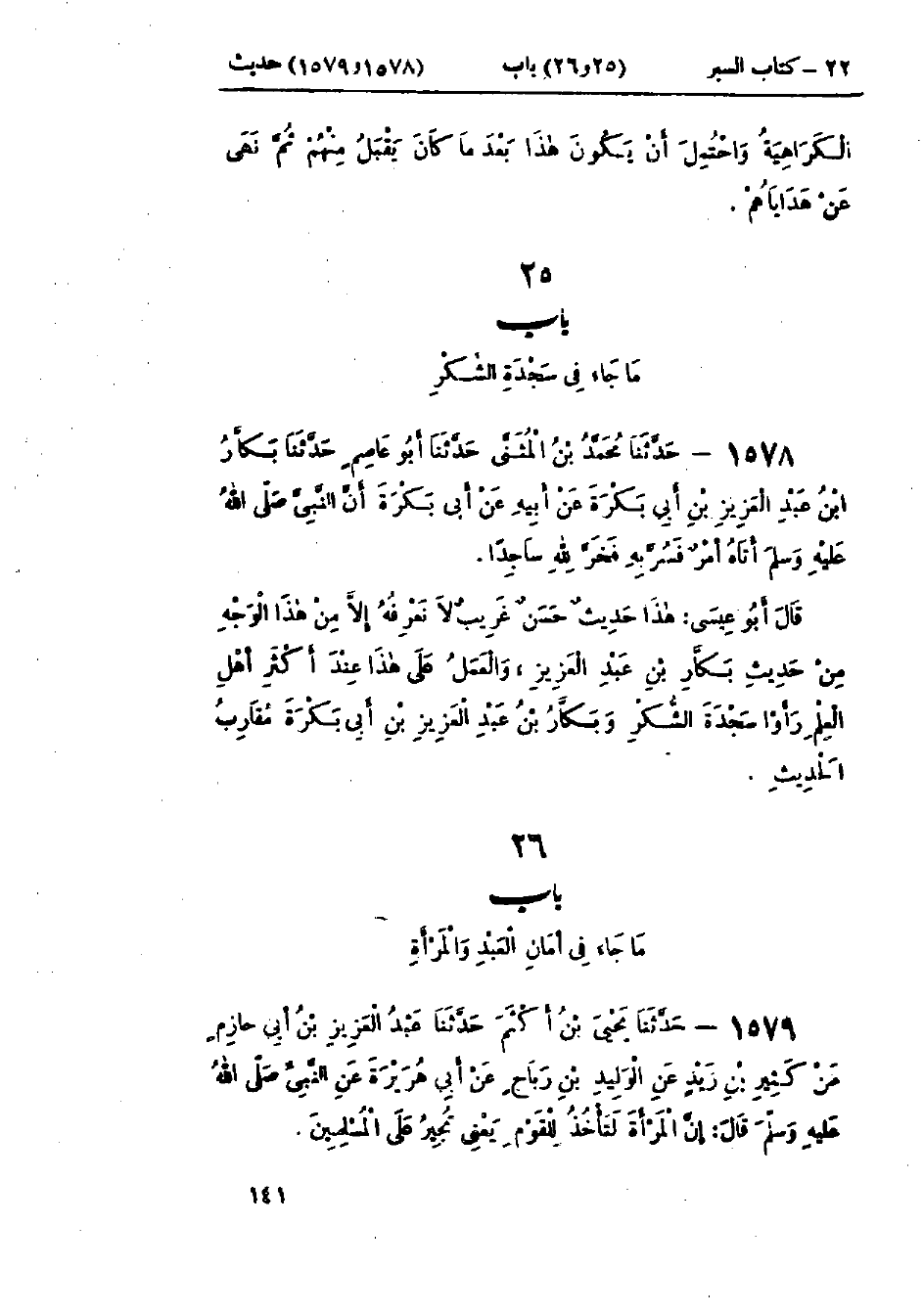 1578 - حَدَّثَنَا مُحَمَّدُ بْنُ المُثَنَّى قَالَ: حَدَّثَنَا أَبُو عَاصِمٍ قَالَ: حَدَّثَنَا بَكَّارُ بْنُ عَبْدِ العَزِيزِ بْنِ أَبِي بَكْرَةَ، عَنْ أَبِيهِ، عَنْ أَبِي بَكْرَةَ، أَنَّ النَّبِيَّ صَلَّى اللَّهُ عَلَيْهِ وَسَلَّمَ «§أَتَاهُ أَمْرٌ، فَسُرَّ بِهِ، فَخَرَّ لِلَّهِ سَاجِدًا»: هَذَا حَدِيثٌ حَسَنٌ غَرِيبٌ لَا نَعْرِفُهُ إِلَّا مِنْ هَذَا الوَجْهِ مِنْ حَدِيثِ بَكَّارِ بْنِ عَبْدِ العَزِيزِ وَالعَمَلُ عَلَى هَذَا عِنْدَ أَكْثَرِ أَهْلِ العِلْمِ رَأَوْا سَجْدَةَ الشُّكْرِ، وَبَكَّارُ بْنُ عَبْدِ العَزِيزِ بْنِ أَبِي بَكْرَةَ مُقَارِبُ الحَدِيثِ