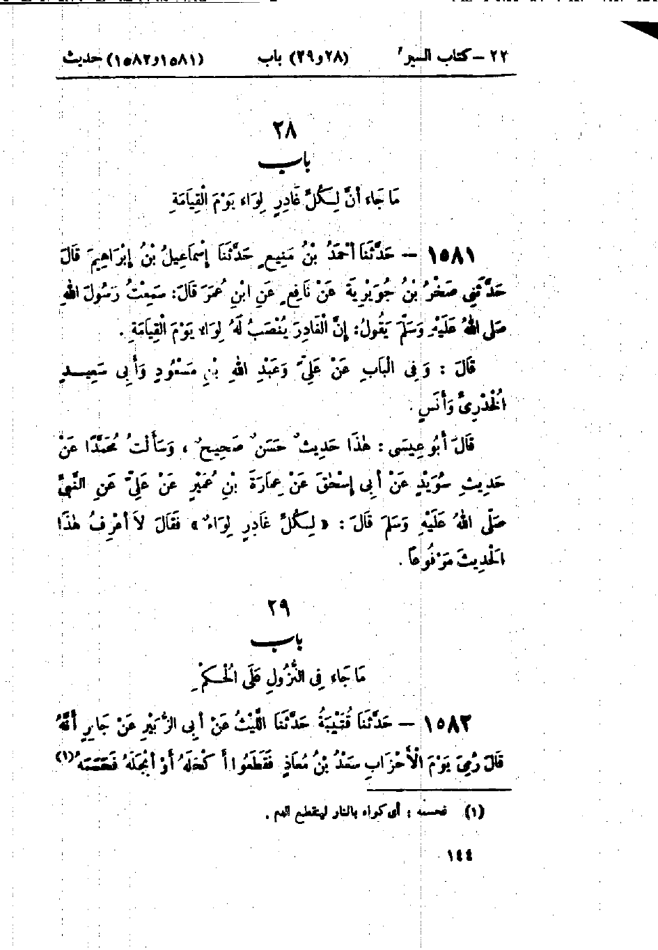 1582 - حَدَّثَنَا قُتَيْبَةُ قَالَ: حَدَّثَنَا اللَّيْثُ، عَنْ أَبِي الزُّبَيْرِ، عَنْ جَابِرٍ، أَنَّهُ قَالَ: رُمِيَ يَوْمَ الأَحْزَابِ سَعْدُ بْنُ مُعَاذٍ فَقَطَعُوا أَكْحَلَهُ أَوْ أَبْجَلَهُ، فَحَسَمَهُ -[145]- رَسُولُ اللَّهِ صَلَّى اللَّهُ عَلَيْهِ وَسَلَّمَ بِالنَّارِ، فَانْتَفَخَتْ يَدُهُ، فَتَرَكَهُ فَنَزَفَهُ الدَّمُ، فَحَسَمَهُ أُخْرَى، فَانْتَفَخَتْ يَدُهُ، فَلَمَّا رَأَى ذَلِكَ، قَالَ: اللَّهُمَّ لَا تُخْرِجْ نَفْسِي حَتَّى تُقِرَّ عَيْنِي مِنْ بَنِي قُرَيْظَةَ، فَاسْتَمْسَكَ عِرْقُهُ، فَمَا قَطَرَ قَطْرَةً، حَتَّى نَزَلُوا عَلَى حُكْمِ سَعْدِ بْنِ مُعَاذٍ، فَأَرْسَلَ إِلَيْهِ، فَحَكَمَ أَنْ يُقْتَلَ رِجَالُهُمْ وَتُسْتَحْيَا نِسَاؤُهُمْ، يَسْتَعِينُ بِهِنَّ المُسْلِمُونَ، فَقَالَ رَسُولُ اللَّهِ صَلَّى اللَّهُ عَلَيْهِ وَسَلَّمَ: «§أَصَبْتَ حُكْمَ اللَّهِ فِيهِمْ»، وَكَانُوا أَرْبَعَ مِائَةٍ، فَلَمَّا فَرَغَ مِنْ قَتْلِهِمْ انْفَتَقَ عِرْقُهُ فَمَاتَ وَفِي البَاب عَنْ أَبِي سَعِيدٍ، وَعَطِيَّةَ القُرَظِيِّ: هَذَا حَدِيثٌ حَسَنٌ صَحِيحٌ