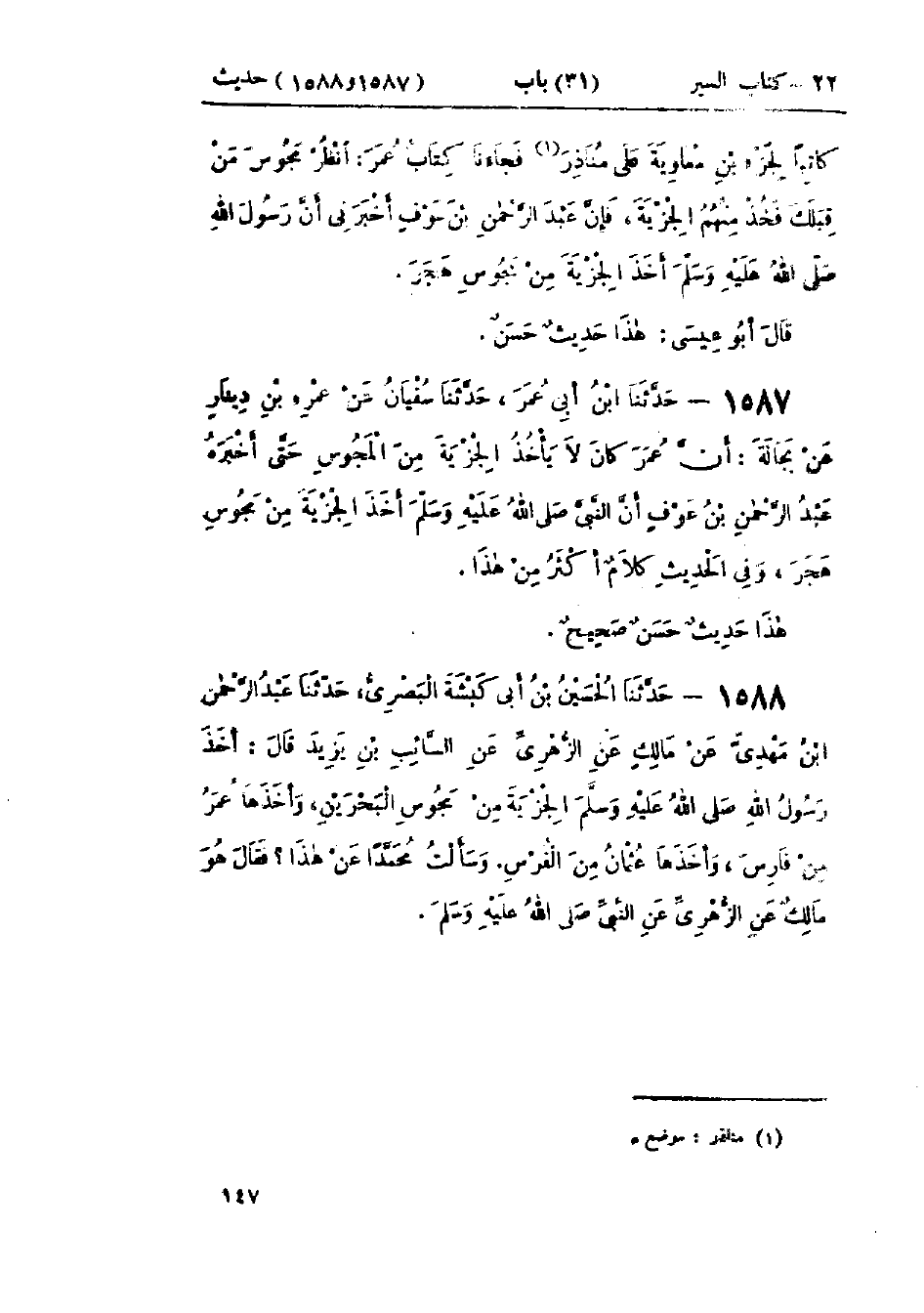 1588 - حَدَّثَنَا الحُسَيْنُ بْنُ أَبِي كَبْشَةَ البَصْرِيُّ قَالَ: حَدَّثَنَا عَبْدُ الرَّحْمَنِ بْنُ مَهْدِيٍّ، عَنْ مَالِكٍ، عَنْ الزُّهْرِيِّ، عَنْ السَّائِبِ بْنِ يَزِيدَ قَالَ: «§أَخَذَ رَسُولُ اللَّهِ صَلَّى اللَّهُ عَلَيْهِ وَسَلَّمَ الجِزْيَةَ مِنْ مَجُوسِ البَحْرَيْنِ»، وَأَخَذَهَا عُمَرُ مِنْ فَارِسَ، وَأَخَذَهَا عُثْمَانُ مِنَ الفُرْسِ، وَسَأَلْتُ مُحَمَّدًا عَنْ هَذَا، فَقَالَ: هُوَ مَالِكٌ، عَنِ الزُّهْرِيِّ، عَنِ النَّبِيِّ صَلَّى اللَّهُ عَلَيْهِ وَسَلَّمَ