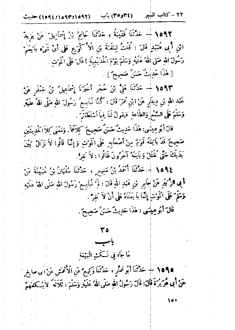 1594 - حَدَّثَنَا أَحْمَدُ بْنُ مَنِيعٍ قَالَ: حَدَّثَنَا سُفْيَانُ بْنُ عُيَيْنَةَ، عَنْ أَبِي الزُّبَيْرِ، عَنْ جَابِرِ بْنِ عَبْدِ اللَّهِ قَالَ: «§لَمْ نُبَايِعْ رَسُولَ اللَّهِ صَلَّى اللَّهُ عَلَيْهِ وَسَلَّمَ عَلَى المَوْتِ، إِنَّمَا بَايَعْنَاهُ عَلَى أَنْ لَا نَفِرَّ»: هَذَا حَدِيثٌ حَسَنٌ صَحِيحٌ. وَمَعْنَى كِلَا الْحَدِيثَيْنِ صَحِيحٌ، قَدْ بَايَعَهُ قَوْمٌ مِنْ أَصْحَابِهِ عَلَى المَوْتِ، وَإِنَّمَا قَالُوا: لَا نَزَالُ بَيْنَ يَدَيْكَ حَتَّى نُقْتَلَ، وَبَايَعَهُ آخَرُونَ، فَقَالُوا: لَا نَفِرُّ