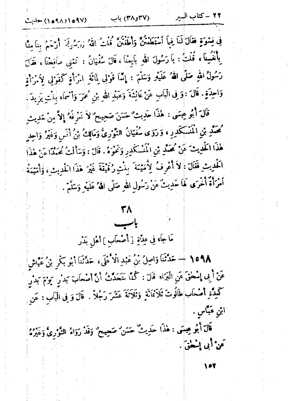 1598 - حَدَّثَنَا وَاصِلُ بْنُ عَبْدِ الأَعْلَى قَالَ: حَدَّثَنَا أَبُو بكْرِ بْنُ عَيَّاشٍ، عَنْ أَبِي إِسْحَاقَ، عَنْ البَرَاءِ قَالَ: «كُنَّا نَتَحَدَّثُ أَنَّ §أَصْحَابَ بَدْرٍ يَوْمَ بَدْرٍ كَعِدَّةِ أَصْحَابِ طَالُوتَ ثَلَاثُ مِائَةٍ وَثَلَاثَةَ عَشَرَ رَجُلًا» وَفِي البَاب عَنْ ابْنِ عَبَّاسٍ: هَذَا حَدِيثٌ حَسَنٌ صَحِيحٌ وَقَدْ رَوَاهُ الثَّوْرِيُّ، وَغَيْرُهُ، عَنْ أَبِي إِسْحَاقَ