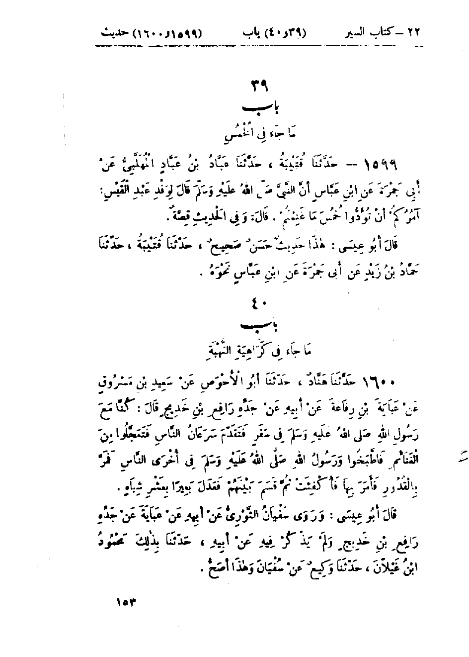 1600 - حَدَّثَنَا هَنَّادٌ قَالَ: حَدَّثَنَا أَبُو الأَحْوَصِ، عَنْ سَعِيدِ بْنِ مَسْرُوقٍ، عَنْ عَبَايَةَ بْنِ رِفَاعَةَ، عَنْ أَبِيهِ، عَنْ جَدِّهِ رَافِعِ بْنِ خَدِيجٍ قَالَ: «كُنَّا مَعَ رَسُولِ اللَّهِ صَلَّى اللَّهُ عَلَيْهِ وَسَلَّمَ فِي سَفَرٍ، فَتَقَدَّمَ سَرَعَانُ النَّاسِ، فَتَعَجَّلُوا مِنَ الغَنَائِمِ، فَاطَّبَخُوا وَرَسُولُ اللَّهِ صَلَّى اللَّهُ عَلَيْهِ وَسَلَّمَ فِي أُخْرَى النَّاسِ، فَمَرَّ بِالقُدُورِ §فَأَمَرَ بِهَا، فَأُكْفِئَتْ، ثُمَّ قَسَمَ بَيْنَهُمْ، فَعَدَلَ بَعِيرًا بِعَشْرِ شِيَاهٍ»: وَرَوَى سُفْيَانُ الثَّوْرِيُّ، عَنْ أَبِيهِ، عَنْ عَبَايَةَ، عَنْ جَدِّهِ رَافِعِ بْنِ خَدِيجٍ وَلَمْ يَذْكُرْ فِيهِ عَنْ أَبِيهِ، حَدَّثَنَا بِذَلِكَ مَحْمُودُ بْنُ غَيْلَانَ قَالَ: حَدَّثَنَا وَكِيعٌ، عَنْ سُفْيَانَ. وَهَذَا أَصَحُّ. -[154]- وَعَبَايَةُ بْنُ رِفَاعَةَ سَمِعَ مِنْ جَدِّهِ رَافِعِ بْنِ خَدِيجٍ وَفِي البَاب عَنْ ثَعْلَبَةَ بْنِ الحَكَمِ، وَأَنَسٍ، وَأَبِي رَيْحَانَةَ، وَأَبِي الدَّرْدَاءِ، وَعَبْدِ الرَّحْمَنِ بْنِ سَمُرَةَ، وَزَيْدِ بْنِ خَالِدٍ، وَجَابِرٍ، وَأَبِي هُرَيْرَةَ، وَأَبِي أَيُّوبَ