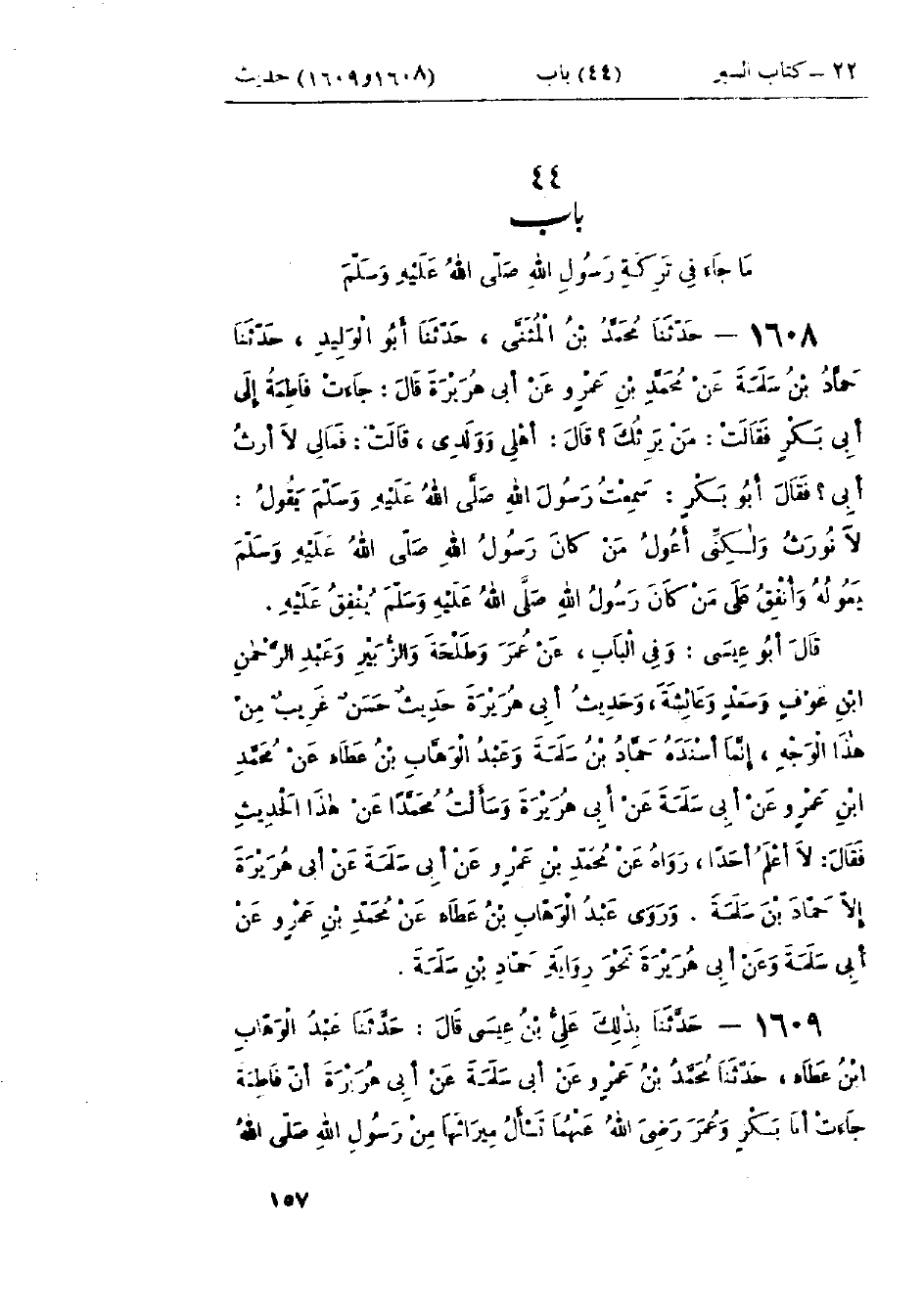 1608 - حَدَّثَنَا مُحَمَّدُ بْنُ المُثَنَّى قَالَ: حَدَّثَنَا أَبُو الوَلِيدِ قَالَ: حَدَّثَنَا حَمَّادُ بْنُ سَلَمَةَ، عَنْ مُحَمَّدِ بْنِ عَمْرٍو، عَنْ أَبِي سَلَمَةَ، عَنْ أَبِي هُرَيْرَةَ قَالَ: جَاءَتْ فَاطِمَةُ إِلَى أَبِي بَكْرٍ، فَقَالَتْ: مَنْ يَرِثُكَ؟ قَالَ: أَهْلِي، وَوَلَدِي، قَالَتْ: فَمَا لِي لَا أَرِثُ أَبِي؟ فَقَالَ أَبُو بَكْرٍ: سَمِعْتُ رَسُولَ اللَّهِ صَلَّى اللَّهُ عَلَيْهِ وَسَلَّمَ يَقُولُ: «§لَا نُورَثُ»، وَلَكِنِّي أَعُولُ مَنْ كَانَ رَسُولُ اللَّهِ صَلَّى اللَّهُ عَلَيْهِ وَسَلَّمَ يَعُولُهُ، وَأُنْفِقُ عَلَى مَنْ كَانَ رَسُولُ اللَّهِ صَلَّى اللَّهُ عَلَيْهِ وَسَلَّمَ يُنْفِقُ عَلَيْهِ: وَفِي البَاب عَنْ عُمَرَ، وَطَلْحَةَ، وَالزُّبَيْرِ، وَعَبْدِ الرَّحْمَنِ بْنِ عَوْفٍ، وَسَعْدٍ، وَعَائِشَةَ وَحَدِيثُ أَبِي هُرَيْرَةَ حَدِيثٌ حَسَنٌ غَرِيبٌ مِنْ هَذَا الوَجْهِ إِنَّمَا أَسْنَدَهُ حَمَّادُ بْنُ سَلَمَةَ، وَعَبْدُ الوَهَّابِ بْنُ عَطَاءٍ، عَنْ مُحَمَّدِ بْنِ عَمْرٍو، عَنْ أَبِي سَلَمَةَ، عَنْ أَبِي هُرَيْرَةَ وَسَأَلْتُ مُحَمَّدًا عَنْ هَذَا الحَدِيثِ، فَقَالَ: «لَا أَعْلَمُ أَحَدًا رَوَاهُ عَنْ مُحَمَّدِ بْنِ عَمْرٍو، عَنْ أَبِي سَلَمَةَ، عَنْ أَبِي هُرَيْرَةَ، إِلَّا حَمَّادَ بْنَ سَلَمَةَ» وَقَدْ رَوَاهُ عَبْدُ الْوَهَّابِ بْنُ عَطَاءٍ، عَنْ مُحَمَّدِ بْنِ عَمْرٍو، عَنْ أَبِي سَلَمَةَ، عَنْ أَبِي هُرَيْرَةَ نَحْوَ رِوَايَةِ حَمَّادِ بْنِ سَلَمَةَ