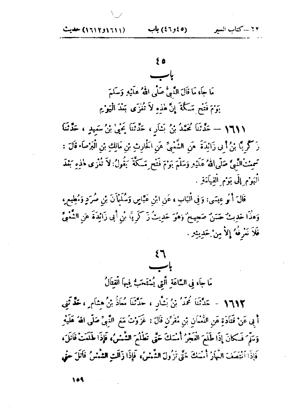 1611 - حَدَّثَنَا مُحَمَّدُ بْنُ بَشَّارٍ قَالَ: حَدَّثَنَا يَحْيَى بْنُ سَعِيدٍ قَالَ: حَدَّثَنَا زَكَرِيَّا بْنُ أَبِي زَائِدَةَ، عَنْ الشَّعْبِيِّ، عَنِ الْحَارِثِ بْنِ مَالِكِ ابْنِ الْبَرْصَاءِ قَالَ: سَمِعْتُ النَّبِيَّ صَلَّى اللَّهُ عَلَيْهِ وَسَلَّمَ يَوْمَ فَتْحِ مَكَّةَ يَقُولُ: «§لَا تُغْزَى هَذِهِ بَعْدَ الْيَوْمِ إِلَى يَوْمِ القِيَامَةِ»: وَفِي البَاب عَنْ ابْنِ عَبَّاسٍ، وَسُلَيْمَانَ بْنِ صُرَدٍ، وَمُطِيعٍ. وَهَذَا حَدِيثٌ حَسَنٌ صَحِيحٌ. وَهُوَ حَدِيثُ زَكَرِيَّا بْنِ أَبِي زَائِدَةَ، عَنِ الشَّعْبِيِّ، فَلَا نَعْرِفُهُ إِلَّا مِنْ حَدِيثِهِ