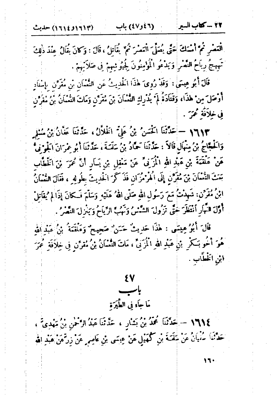 1613 - حَدَّثَنَا الحَسَنُ بْنُ عَلِيٍّ الخَلَّالُ قَالَ: حَدَّثَنَا عَفَّانُ بْنُ مُسْلِمٍ، وَالحَجَّاجُ بْنُ مِنْهَالٍ، قَالَا: حَدَّثَنَا حَمَّادُ بْنُ سَلَمَةَ قَالَ: حَدَّثَنَا أَبُو عِمْرَانَ الجَوْنِيُّ، عَنْ عَلْقَمَةَ بْنِ عَبْدِ اللَّهِ المُزَنِيِّ، عَنْ مَعْقِلِ بْنِ يَسَارٍ، أَنَّ عُمَرَ بْنَ الخَطَّابِ بَعَثَ النُّعْمَانَ بْنَ مُقَرِّنٍ إِلَى الهُرْمُزَانِ - فَذَكَرَ الحَدِيثَ بِطُولِهِ -، فَقَالَ النُّعْمَانُ بْنُ مُقَرِّنٍ: «شَهِدْتُ مَعَ رَسُولِ اللَّهِ صَلَّى اللَّهُ عَلَيْهِ وَسَلَّمَ فَكَانَ §إِذَا لَمْ يُقَاتِلْ أَوَّلَ النَّهَارِ انْتَظَرَ حَتَّى تَزُولَ الشَّمْسُ، وَتَهُبَّ الرِّيَاحُ، وَيَنْزِلَ النَّصْرُ»: هَذَا حَدِيثٌ حَسَنٌ صَحِيحٌ. وَعَلْقَمَةُ بْنُ عَبْدِ اللَّهِ هُوَ أَخُو بَكْرِ بْنِ عَبْدِ اللَّهِ المُزَنِيِّ