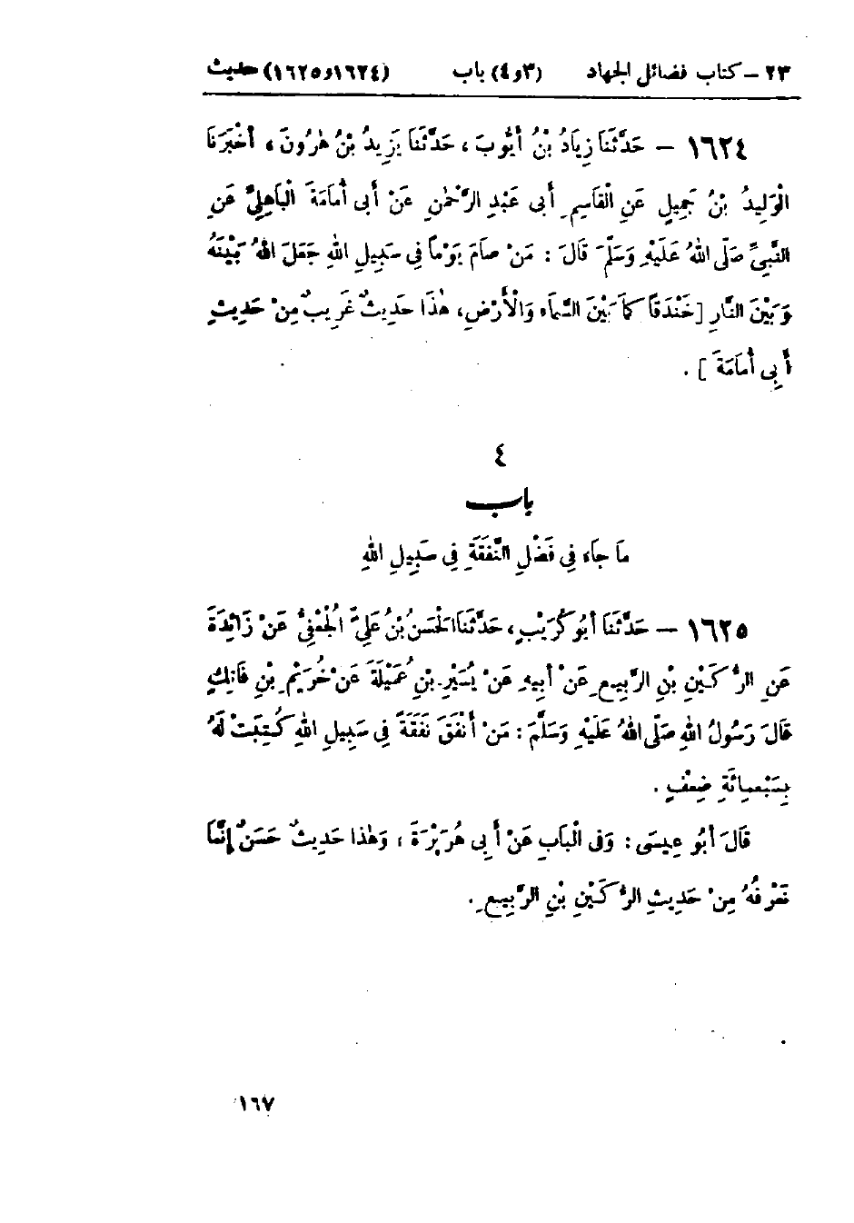 1624 - حَدَّثَنَا زِيَادُ بْنُ أَيُّوبَ قَالَ: حَدَّثَنَا يَزِيدُ بْنُ هَارُونَ قَالَ: أَخْبَرَنَا الوَلِيدُ بْنُ جَمِيلٍ، عَنْ القَاسِمِ أَبِي عَبْدِ الرَّحْمَنِ، عَنْ أَبِي أُمَامَةَ البَاهِلِيِّ، عَنِ النَّبِيِّ صَلَّى اللَّهُ عَلَيْهِ وَسَلَّمَ قَالَ: «§مَنْ صَامَ يَوْمًا فِي سَبِيلِ اللَّهِ جَعَلَ اللَّهُ بَيْنَهُ وَبَيْنَ النَّارِ خَنْدَقًا كَمَا بَيْنَ السَّمَاءِ وَالأَرْضِ» هَذَا حَدِيثٌ غَرِيبٌ مِنْ حَدِيثِ أَبِي أُمَامَةَ