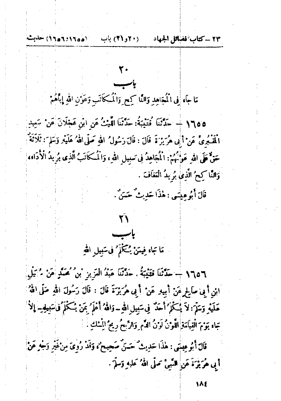 1656 - حَدَّثَنَا قُتَيْبَةُ قَالَ: حَدَّثَنَا عَبْدُ العَزِيزِ بْنُ مُحَمَّدٍ، عَنْ سُهَيْلِ بْنِ أَبِي صَالِحٍ، عَنْ أَبِيهِ، عَنْ أَبِي هُرَيْرَةَ قَالَ: قَالَ رَسُولُ اللَّهِ صَلَّى اللَّهُ عَلَيْهِ وَسَلَّمَ: «§لَا يُكْلَمُ أَحَدٌ فِي سَبِيلِ اللَّهِ، وَاللَّهُ أَعْلَمُ بِمَنْ يُكْلَمُ فِي سَبِيلِهِ، إِلَّا جَاءَ يَوْمَ القِيَامَةِ اللَّوْنُ لَوْنُ الدَّمِ، وَالرِّيحُ رِيحُ المِسْكِ»: هَذَا حَدِيثٌ حَسَنٌ صَحِيحٌ، وَقَدْ رُوِيَ مِنْ غَيْرِ وَجْهٍ، عَنْ أَبِي هُرَيْرَةَ، عَنِ النَّبِيِّ صَلَّى اللَّهُ عَلَيْهِ وَسَلَّمَ