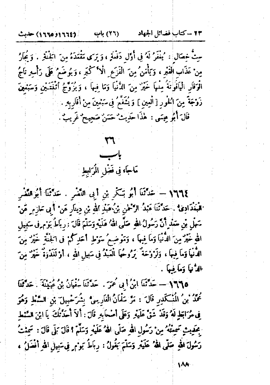 1664 - حَدَّثَنَا أَبُو بَكْرِ بْنُ أَبِي النَّضْرِ قَالَ: حَدَّثَنَا أَبُو النَّضْرِ البَغْدَادِيُّ قَالَ: حَدَّثَنَا عَبْدُ الرَّحْمَنِ بْنُ عَبْدِ اللَّهِ بْنِ دِينَارٍ، عَنْ أَبِي حَازِمٍ، عَنْ سَهْلِ بْنِ سَعْدٍ، أَنَّ رَسُولَ اللَّهِ صَلَّى اللَّهُ عَلَيْهِ وَسَلَّمَ قَالَ: «§رِبَاطُ يَوْمٍ فِي سَبِيلِ اللَّهِ خَيْرٌ مِنَ الدُّنْيَا وَمَا فِيهَا، وَمَوْضِعُ سَوْطِ أَحَدِكُمْ فِي الجَنَّةِ خَيْرٌ مِنَ الدُّنْيَا وَمَا فِيهَا، وَلَرَوْحَةٌ يَرُوحُهَا العَبْدُ فِي سَبِيلِ اللَّهِ أَوْ لَغَدْوَةٌ خَيْرٌ مِنَ الدُّنْيَا وَمَا فِيهَا» هَذَا حَدِيثٌ حَسَنٌ صَحِيحٌ