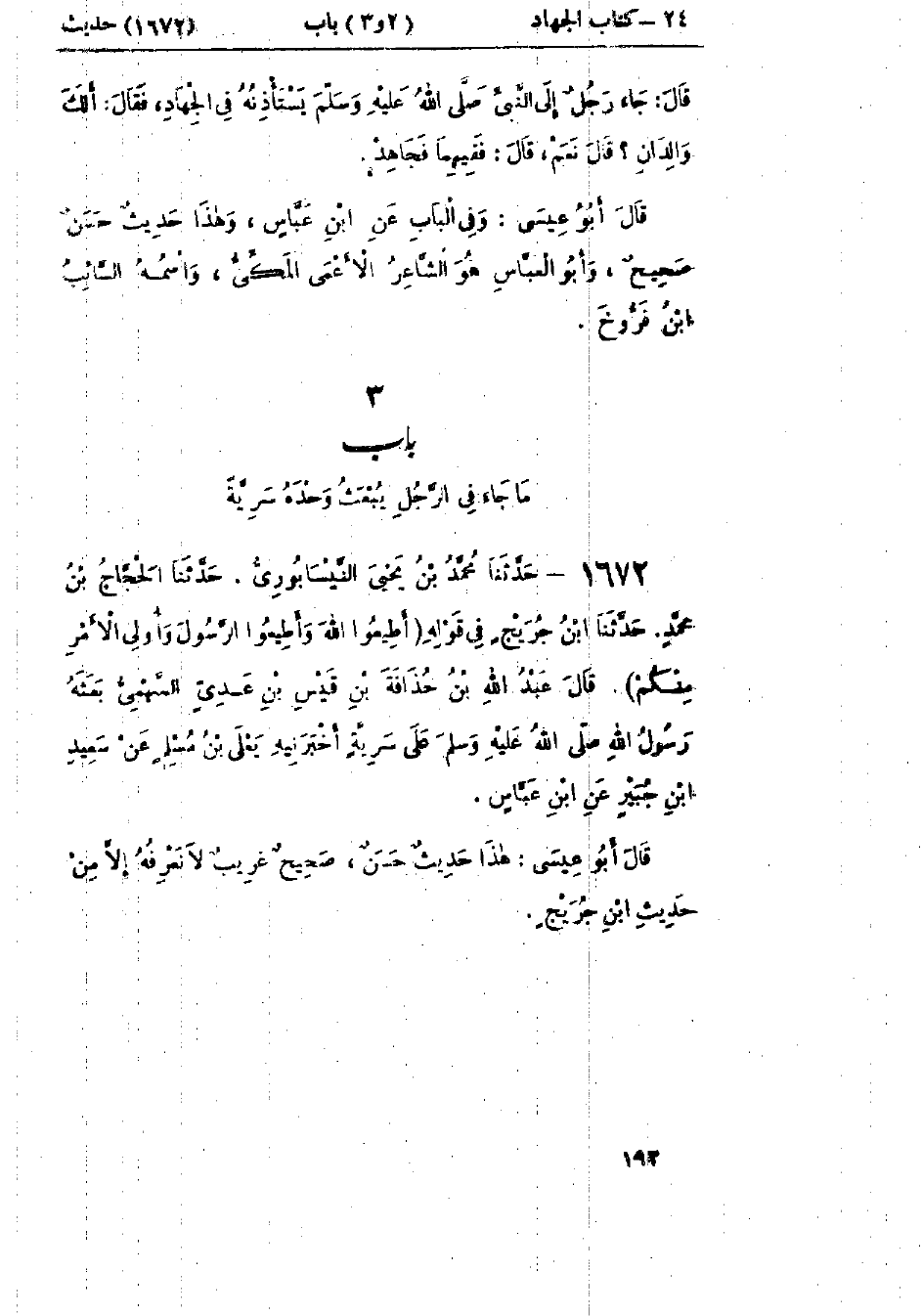 1672 - حَدَّثَنَا مُحَمَّدُ بْنُ يَحْيَى النَّيْسَابُورِيُّ قَالَ: حَدَّثَنَا الحَجَّاجُ بْنُ مُحَمَّدٍ قَالَ: حَدَّثَنَا ابْنُ جُرَيْجٍ، فِي قَوْلِهِ: {§أَطِيعُوا اللَّهَ وَأَطِيعُوا الرَّسُولَ وَأُولِي الأَمْرِ مِنْكُمْ} [النساء: 59]، قَالَ: «عَبْدُ اللَّهِ بْنُ حُذَافَةَ بْنِ قَيْسِ بْنِ عَدِيٍّ السَّهْمِيُّ بَعَثَهُ رَسُولُ اللَّهِ صَلَّى اللَّهُ عَلَيْهِ وَسَلَّمَ عَلَى سَرِيَّةٍ» أَخْبَرَنِيهِ يَعْلَى بْنُ مُسْلِمٍ، عَنْ سَعِيدِ بْنِ جُبَيْرٍ، عَنْ ابْنِ عَبَّاسٍ.: هَذَا حَدِيثٌ حَسَنٌ صَحِيحٌ غَرِيبٌ لَا نَعْرِفُهُ إِلَّا مِنْ حَدِيثِ ابْنِ جُرَيْجٍ