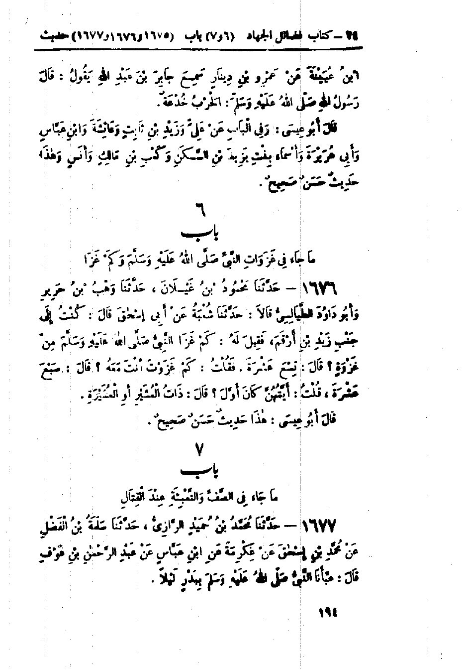 1676 - حَدَّثَنَا مَحْمُودُ بْنُ غَيْلَانَ قَالَ: حَدَّثَنَا وَهْبُ بْنُ جَرِيرٍ، وَأَبُو دَاوُدَ الطَّيَالِسِيُّ قَالَا: حَدَّثَنَا شُعْبَةُ، عَنْ أَبِي إِسْحَاقَ، قَالَ: كُنْتُ إِلَى جَنْبِ زَيْدِ بْنِ أَرْقَمَ، فَقِيلَ لَهُ: كَمْ غَزَا النَّبِيُّ صَلَّى اللَّهُ عَلَيْهِ وَسَلَّمَ مِنْ غَزْوَةٍ؟ قَالَ: «§تِسْعَ عَشْرَةَ»، فَقُلْتُ: كَمْ غَزَوْتَ أَنْتَ مَعَهُ؟ قَالَ: «سَبْعَ عَشْرَةَ»، قُلْتُ: أَيَّتُهُنَّ كَانَ أَوَّلَ؟ قَالَ: «ذَاتُ العُشَيْرِ، أَوِ العُشَيْرَةِ»: هَذَا حَدِيثٌ حَسَنٌ صَحِيحٌ