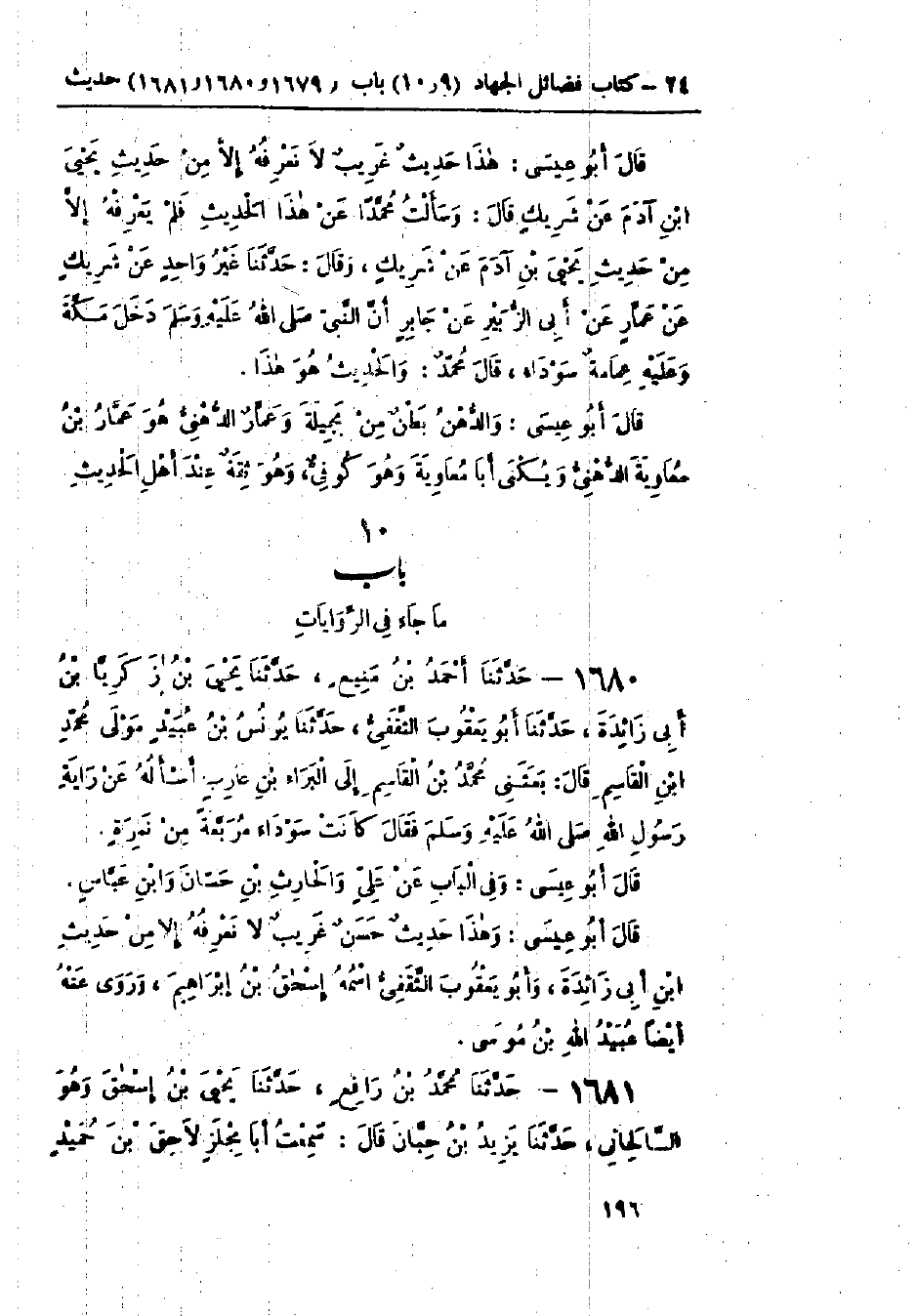1680 - حَدَّثَنَا أَحْمَدُ بْنُ مَنِيعٍ قَالَ: حَدَّثَنَا يَحْيَى بْنُ زَكَرِيَّا بْنِ أَبِي زَائِدَةَ قَالَ: حَدَّثَنَا أَبُو يَعْقُوبَ الثَّقَفِيُّ قَالَ: حَدَّثَنَا يُونُسُ بْنُ عُبَيْدٍ، مَوْلَى مُحَمَّدِ بْنِ القَاسِمِ قَالَ: بَعَثَنِي مُحَمَّدُ بْنُ القَاسِمِ إِلَى البَرَاءِ بْنِ عَازِبٍ أَسْأَلُهُ عَنْ رَايَةِ رَسُولِ اللَّهِ صَلَّى اللَّهُ عَلَيْهِ وَسَلَّمَ، فَقَالَ: «§كَانَتْ سَوْدَاءَ مُرَبَّعَةً مِنْ نَمِرَةٍ»: وَفِي البَاب عَنْ عَلِيٍّ، وَالحَارِثِ بْنِ حَسَّانَ، وَابْنِ عَبَّاسٍ: وَهَذَا حَدِيثٌ حَسَنٌ غَرِيبٌ لَا نَعْرِفُهُ إِلَّا مِنْ حَدِيثِ ابْنِ أَبِي زَائِدَةَ، وَأَبُو يَعْقُوبَ الثَّقَفِيُّ اسْمُهُ: إِسْحَاقُ بْنُ إِبْرَاهِيمَ، وَرَوَى عَنْهُ أَيْضًا عُبَيْدُ اللَّهِ بْنُ مُوسَى